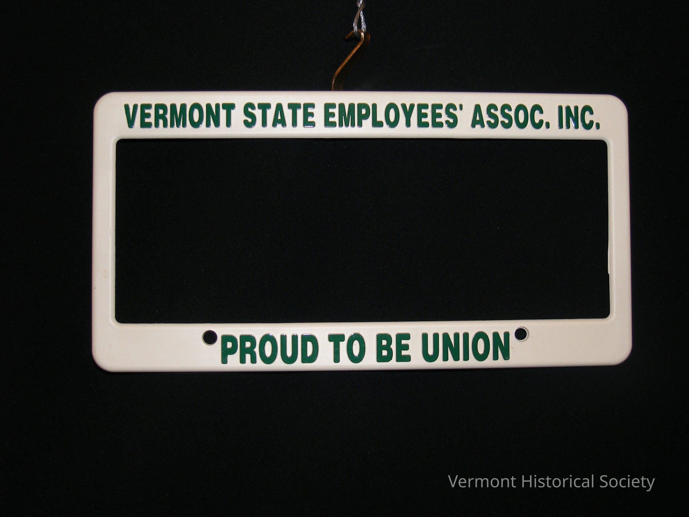 Two license plate holders made of white plastic with green lettering: "VERMONT STATE EMPLOYEES' ASSOC. INC. / PROUD TO BE UNION"