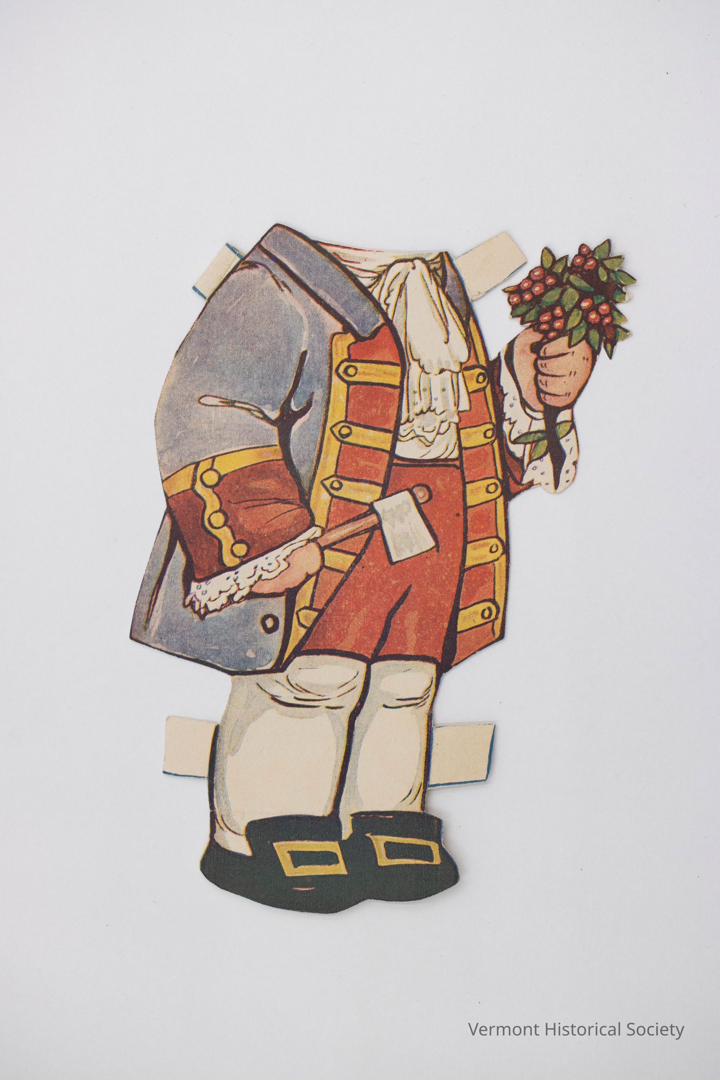 Printed paper George Washington costume for a paper doll. It consists of a blue coat, white frilly shirt, red breeches, white stockings, and black shoes with gold buckles. One pink hand is holding a small axe and the other is holding a stem with green leaves and red berries (cherries).Context