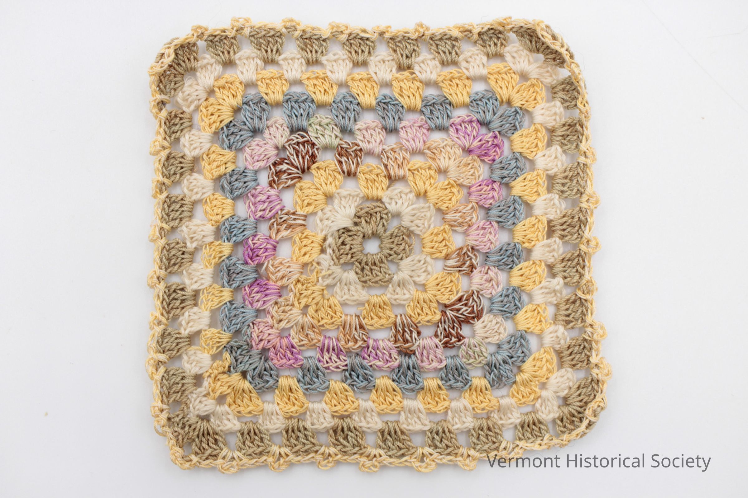 Small, crocheted "granny square" made for use as a rug in a dollhouse. The piece is crocheted out of lace-weight yarn, alternating colors by row. The colors are beige, cream, yellow, variegated brown/cream, variegated purple/green, blue, yellow, cream, beige. It consists primarily of treble-stitches.Context
