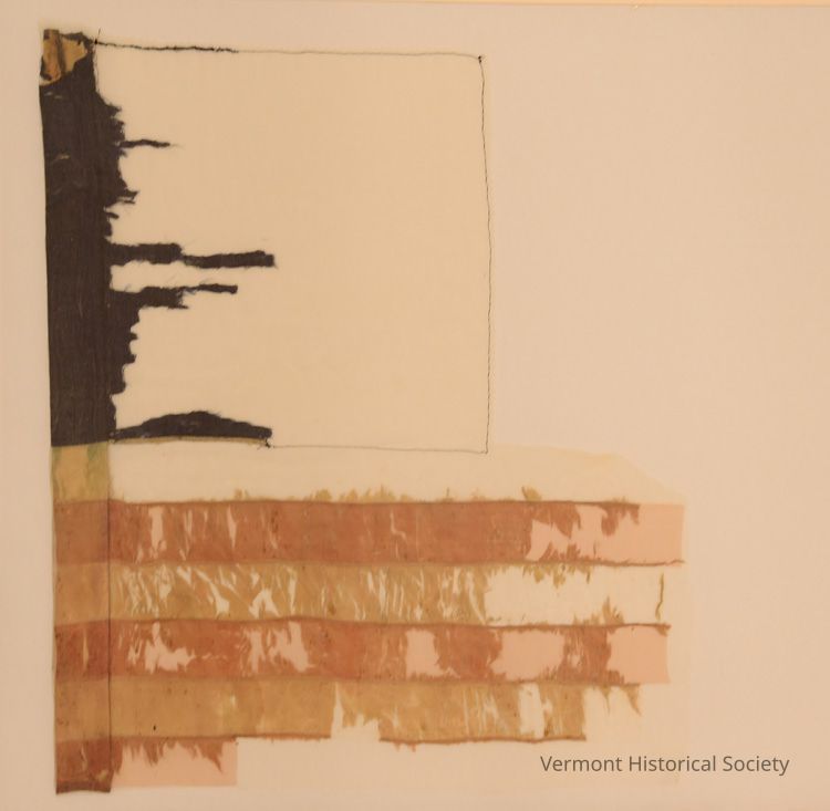 National guidon of the 3rd Vermont Light Artillery Battery. Silk with red and white stripes, blue canton and painted stars (only a single star is extant). Guidon may originally have had a swallowtail shape. A sleeve attached guidon to staff. Finial is missing.