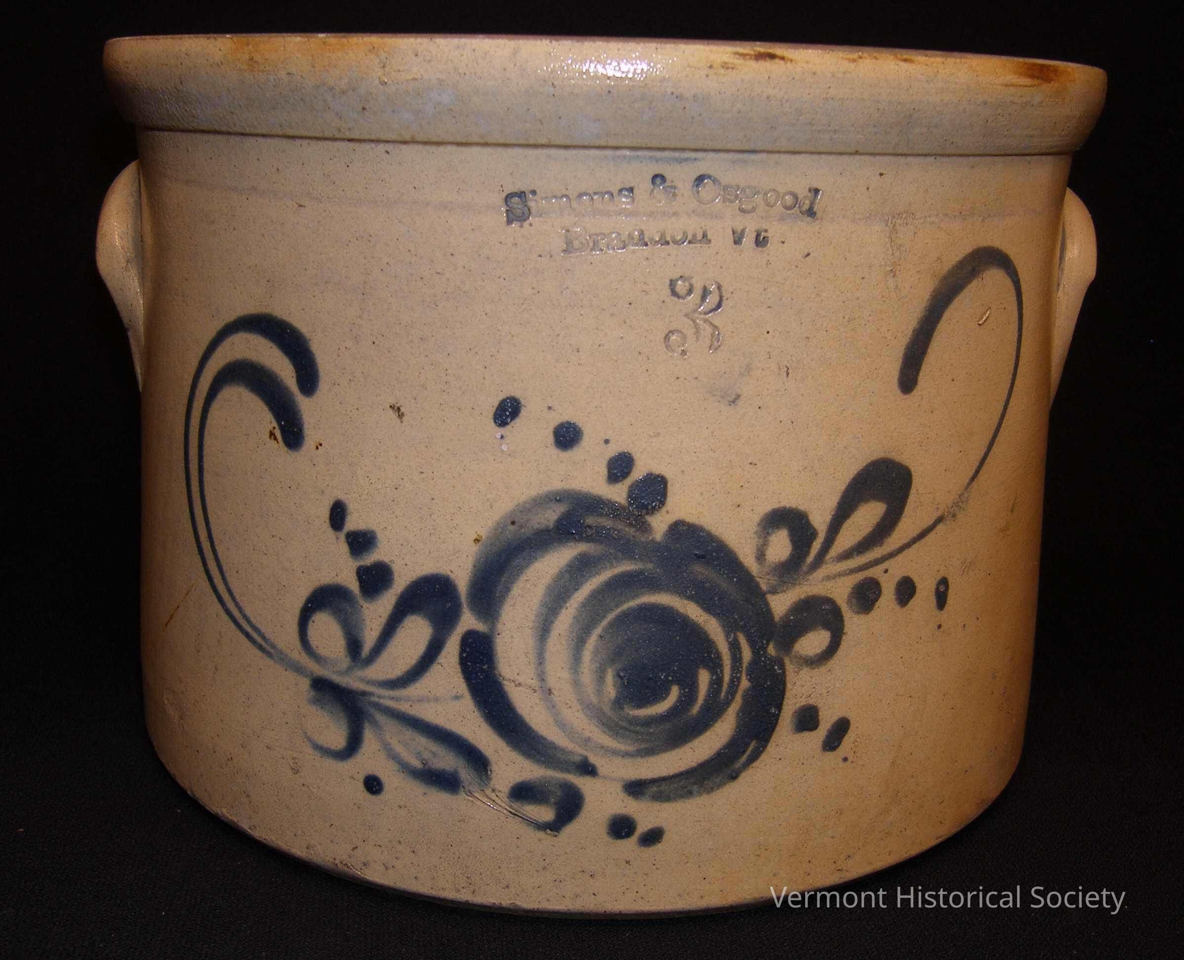 Straight-sided stoneware crock with a hand-painted decoration of a flower. There are two U-shaped handles applied to either side. At the top center is the stamped label, "Simons & Osgood / Brandon Vt / 3".Context