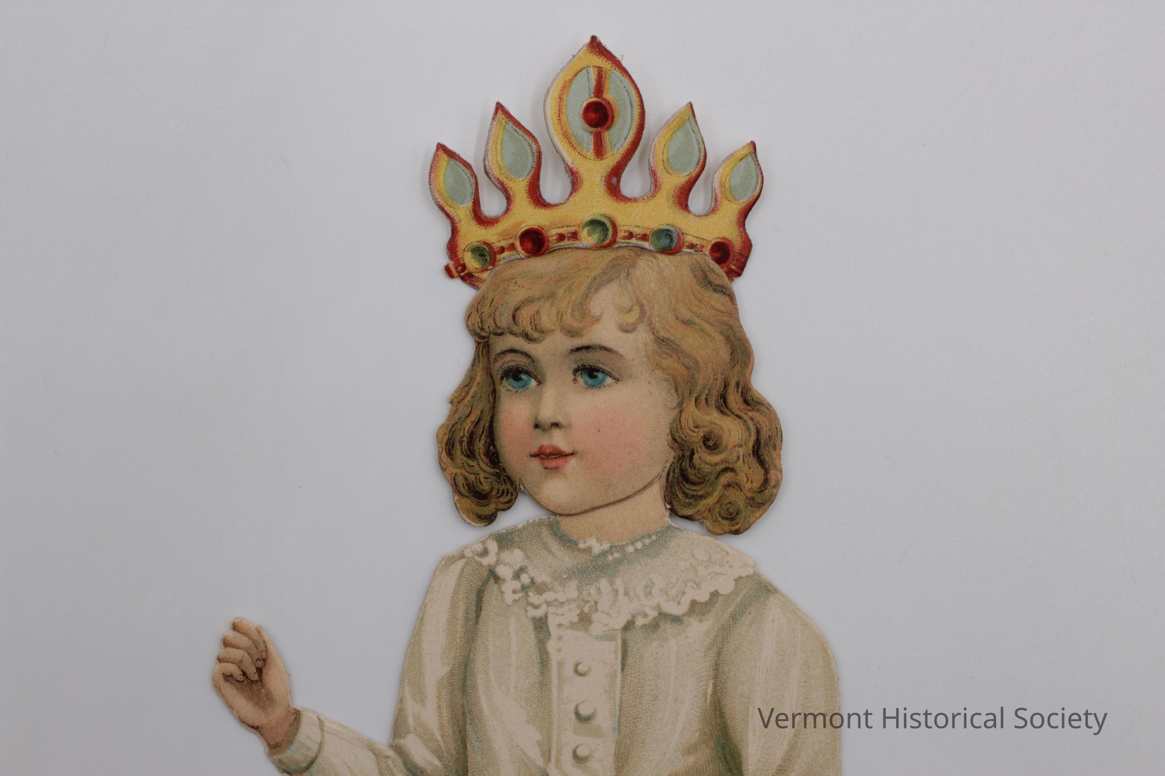 Five-pointed crown for a paper doll. The bottom of the crown is cut with a slit for inserting the paper doll, and a triangular tab that hangs behind the doll's head.Context
