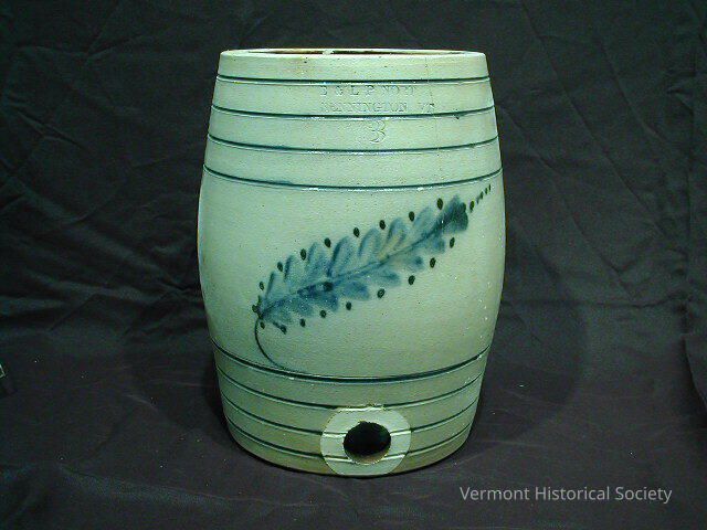 Salt-glazed stoneware water cooler. The barrel-shaped cooler is decorated with four incised horizontal lines around both the top and the bottom, and a large hand-painted feather or fern leaf. There is a large, round hole and bottom center, but the spout is not missing. At the top center is the stamped label, "E. & L.P. NORTON BENNINGTON VT. 3". The interior is glazed dark brown.Context
