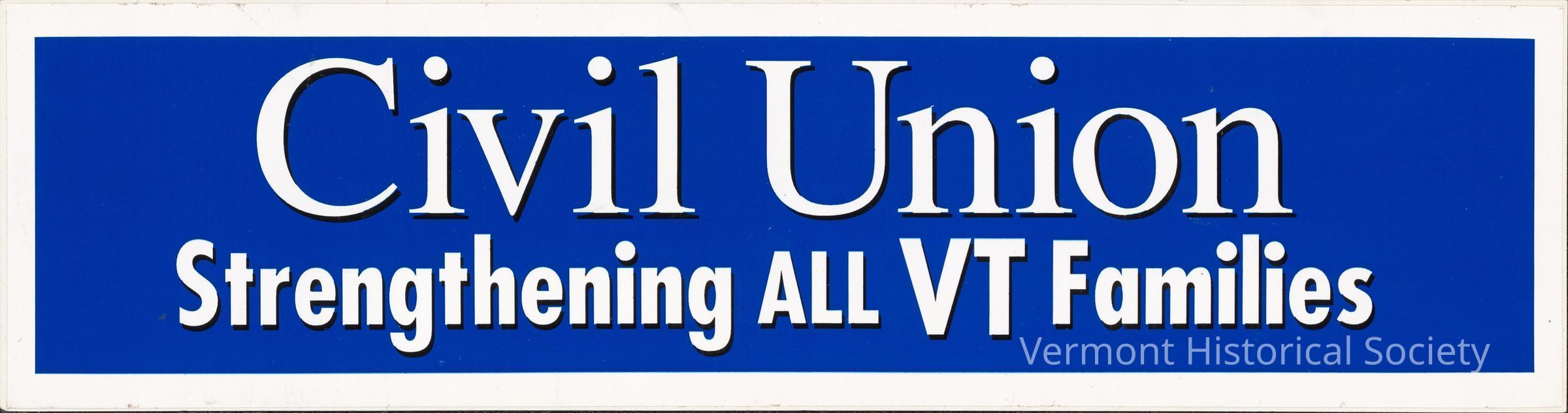 Bumper sticker with text "Civil Union Strengthening ALL VT Families" in white on blue background.Context
