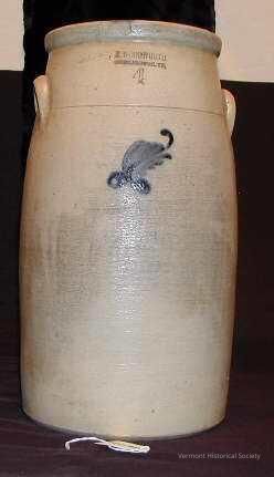 Tall stoneware butter churn with a hand-painted decoration of a flower or flourish. There are U-shaped handles applied to both sides, and a line is inscribed around the piece at the attachment point of the handles. Above the line is the stamped label, "R. WOODWORTH / BURLINGOTN. VT. / 4".