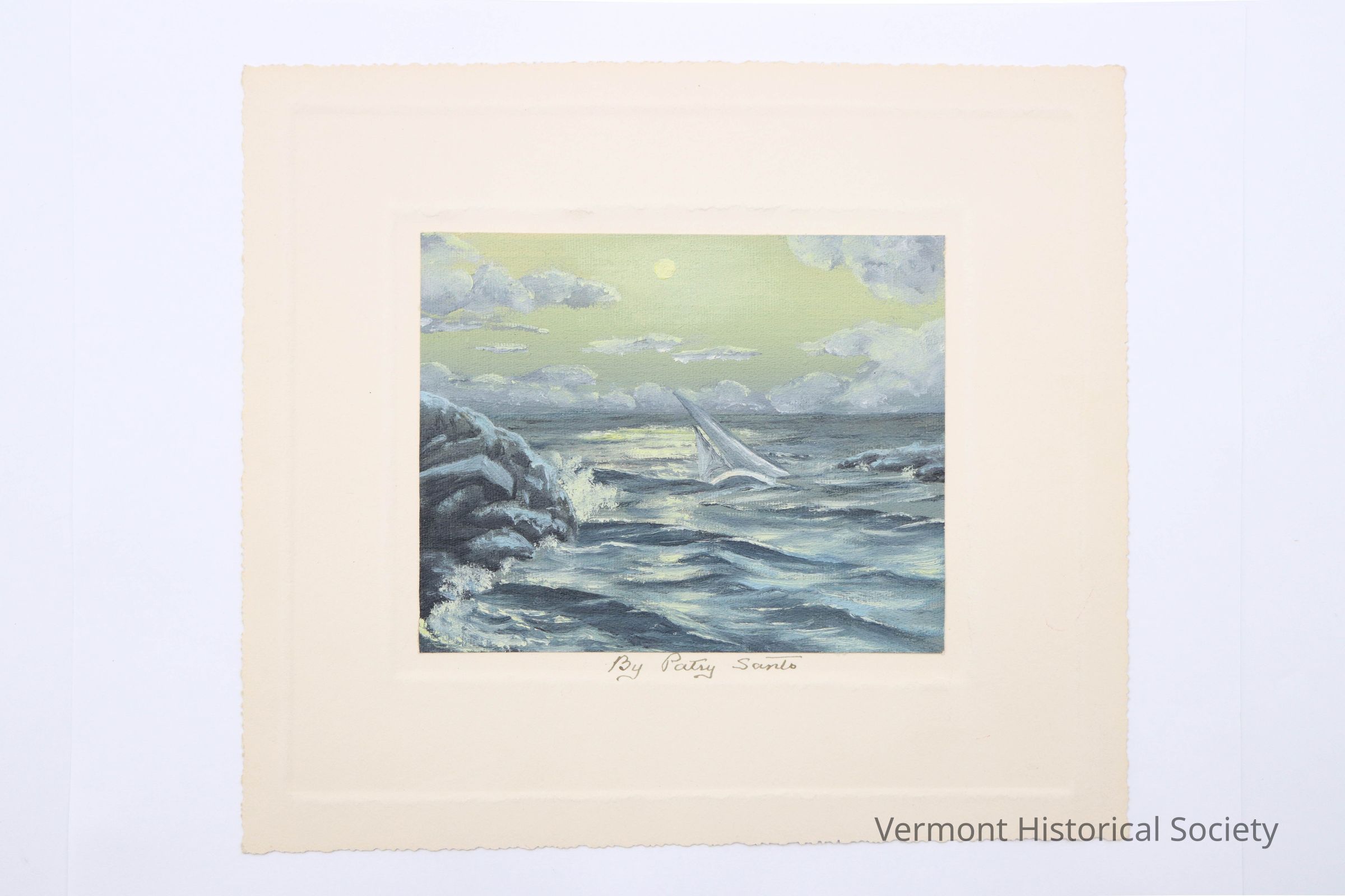 Small acrylic painting on paper depicting a small sailboat in a rough sea. There is a rock at the left of the composition with waves crashing against it. The sailboat is leaning to the left with water crashing upward against it. There are clouds in the sky along the horizon and around the edges of the composition. The middle of the sky is depicted in shades of green. The painting is surrounded by a wide border of paper and signed "By Patsy Santo" beneath the painting.Type of Painting