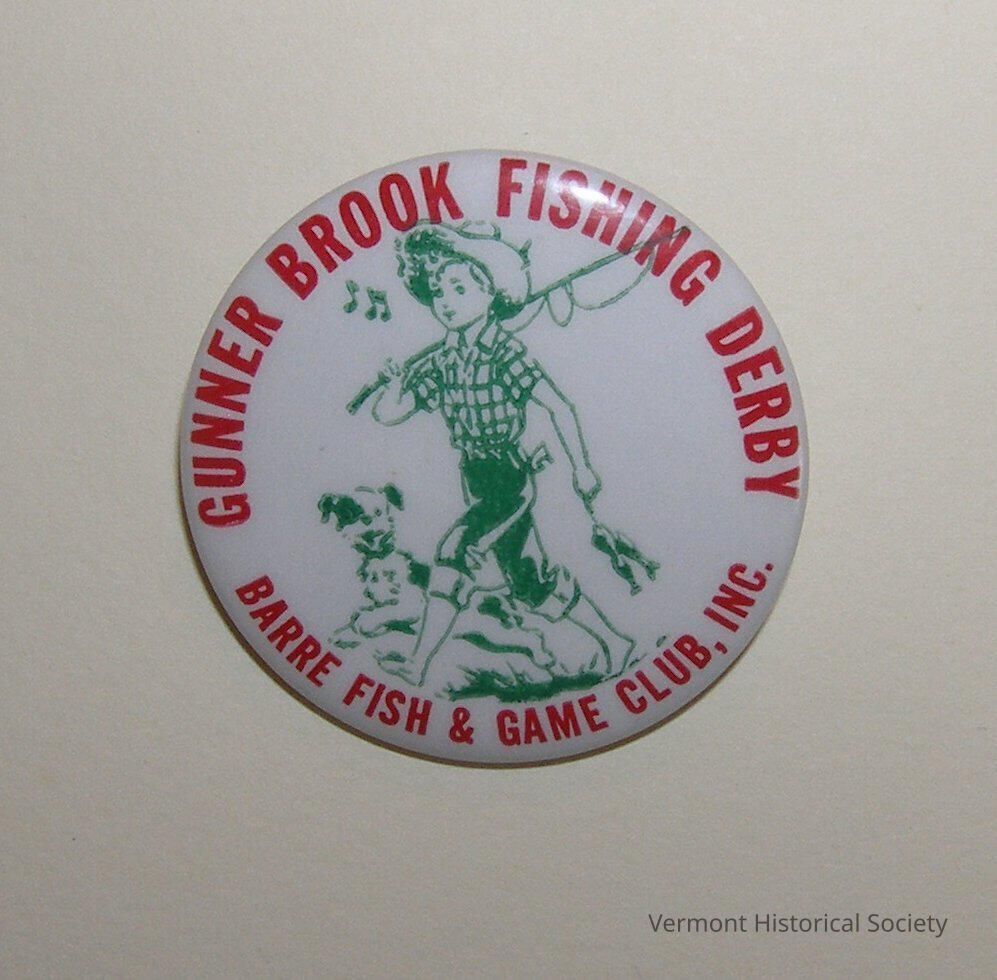 Round white metal button with the red inscription, "GUNNER BROOK FISHING DERBY BARRE FISH & GAME CLUB, INC." around the edge. The center is printed in green with an image of a young boy and a puppy. The boy is wearing rolled up pants, a plaid collard shirt, and a straw hat. He is holding a fishing rod in one hand and string of fish in the other.
