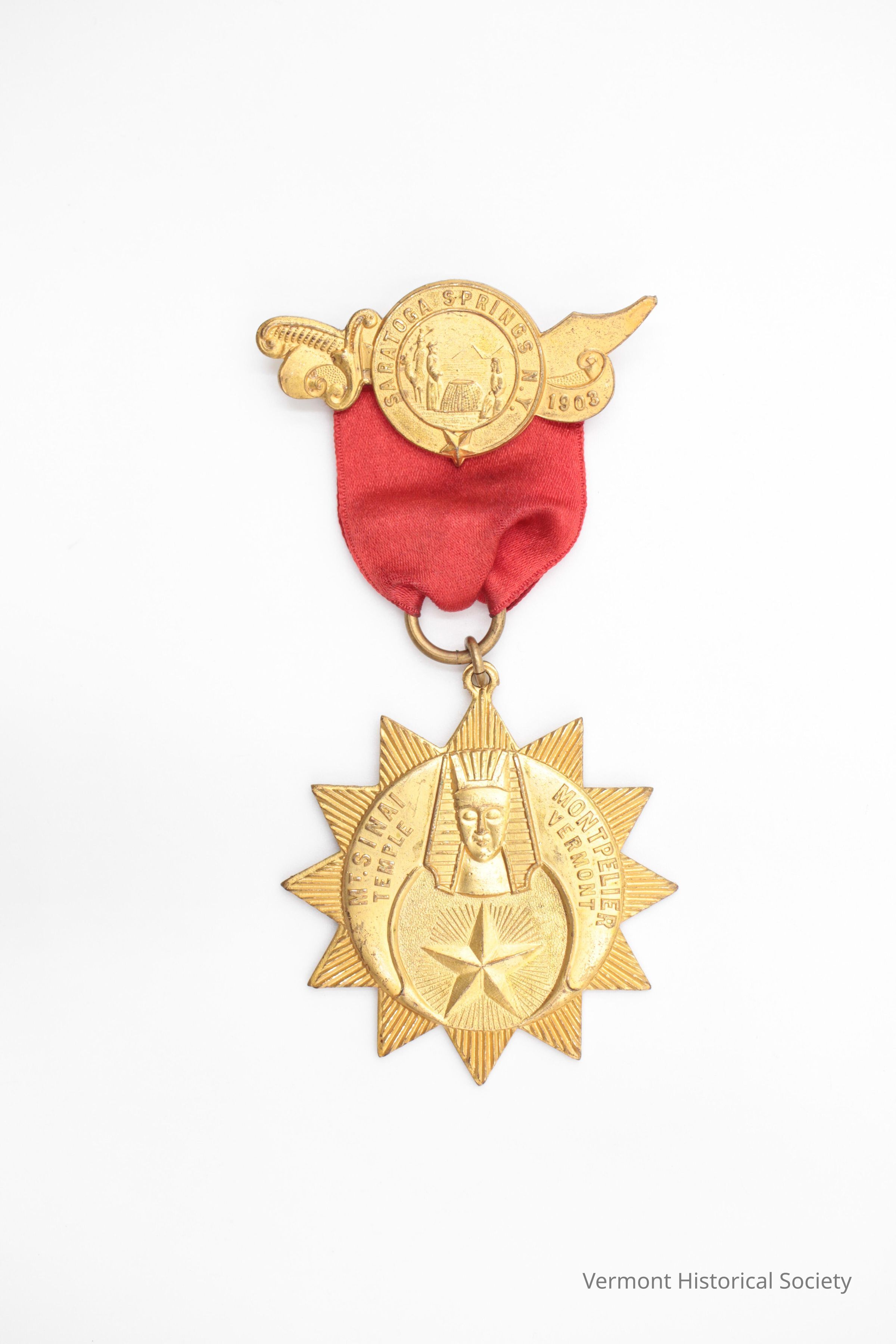 Membership ribbon consisting of a bar, a ribbon, and a medallion. The bar is in the shape of a curved sword with a round icon in the center that shows a scene of three people and a camel with pyramids in the background and the inscription "SARATOGA SPRINGS N.Y. 1903" The red satin-wove ribbon is looped around a wire at the back of the bar and has an eye ring looped through the bottom. The circular medallion hangs from the eye ring and has triangles radiating out all the way around. In the center is an image of a head wearing a pharaoh's crown above a five-pointed star. The inscription, "MT. SINAI TEMPLE / MONTPELIER VERMONT" flanks the head.