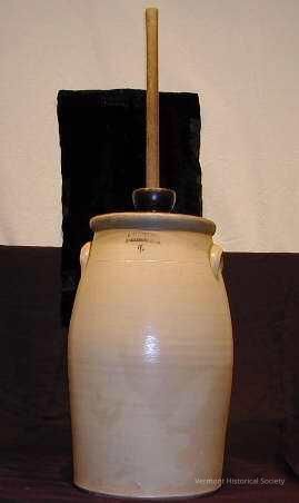 Large, glazed earthenware churn. There are U-shaped handles applied to either side of the churn, and a line is incised around the body at their attachment point. Above the line is the stamped inscription, "F. WOODWORTH BURLINGTON, VT 6". The churn has a small, dark-brown glazed lid that sits inside the lip. The lid has a hole in the center with a small, cup-shaped surround. There is a wooden dasher through the center hole.Context