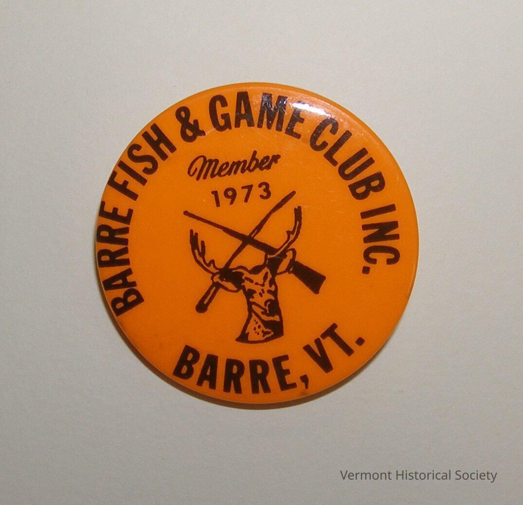 Round orange metal button with the black inscription, "BARRE FISH & GAME CLUB INC. BARRE, VT." around the edge. The center is printed with an image of a stag's head in front of crossed long gun and fishing rod and the words, "Member 1973".Context
