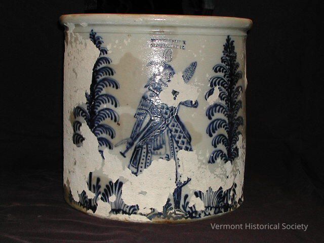 Large stoneware crock decorated in blue slip with an image of a person between two trees. The center top is impressed with the label, "Fenton & Hancock / St. Johnsbury, VT. / 6".