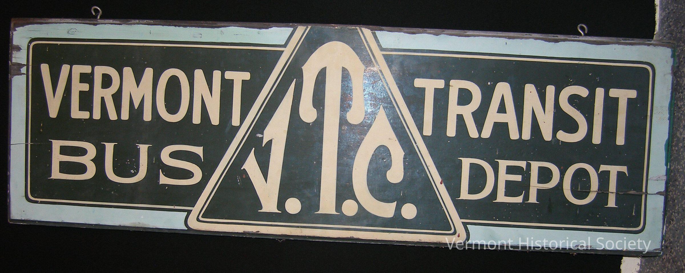 Wooden "Vermont Transit (in evenly thick yet simplistic lettering)/ Bus Depot"(in stylized thick stroke lettering) "V.T.C." (in painted looking letters, melting into the shape of the triangle with drip-looking curls and accentuated points) sign, top of center triangle is missing. Dark green with aqua blue/green/cream colored multi-band border around edge. Lettering painted in cream color. Screw eyes screwed into top edge for hanging.Context