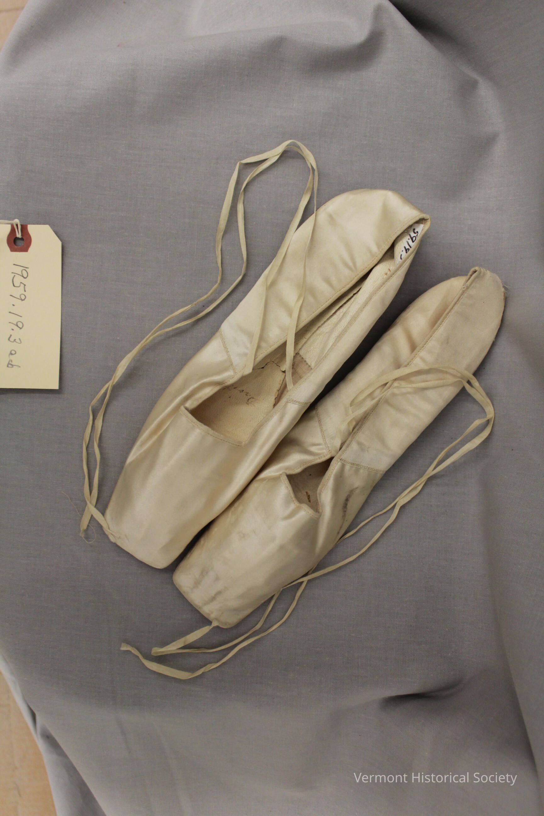 Pair of white silk shoes. The uppers are made from cream-colored satin-woven silk and are constructed in three parts: the toe/front, the back left, and the back right. The upper is lined with glazed linen in the toe and white kid leather in the heel. The insole is white kid leather. The toe of the shoe is square, and the front of the foot opening is square to echo the shape. The soles are straight cut and made of leather. The word, "Droit", is written on the insole of one shoe, indicating that it was worn on the right foot. There is a paper label at the center of one insole that reads, "C. MIDDLETON, Maker, 279 Broadway, NEW-YORK". The numbers, "-5/-864", are inked on the toe of one sole. The foot opening is bound with silk ribbon, and there are two silk ribbons attached at the side seams for tying around the wearer's ankle.Context