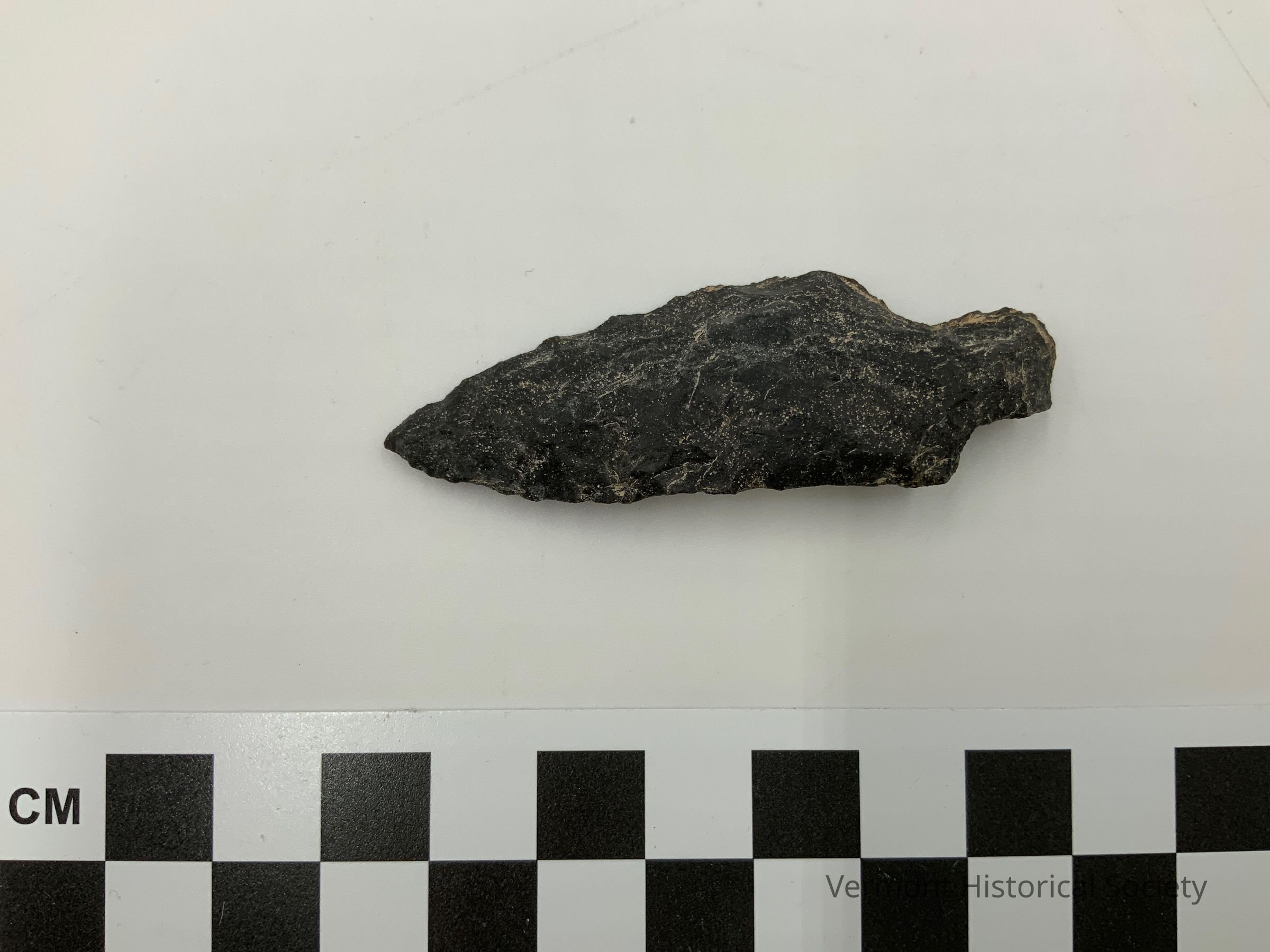 Black chipped stone projectile point with a straight stem. The blade edges are asymmetrical with one straight edge and one edge the curves outward.