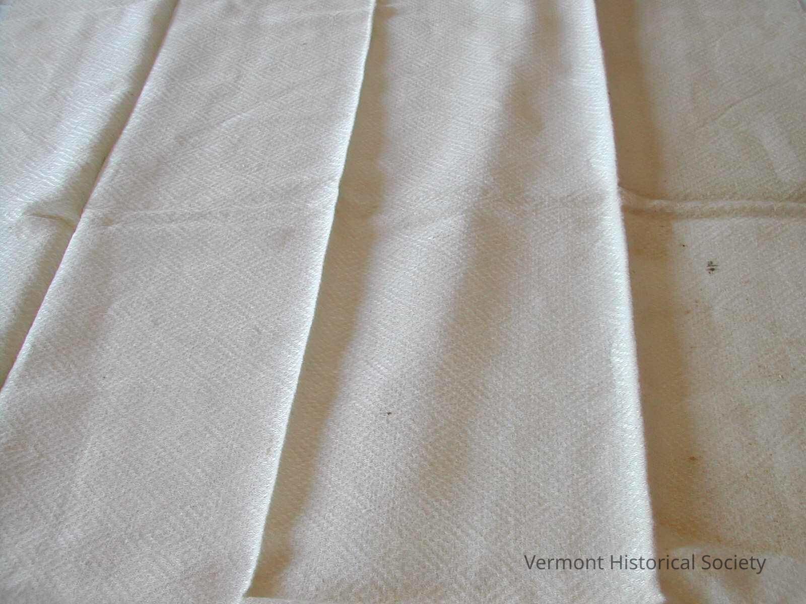 Large, handwoven white linen towel in a spot weave. There is a hanger tab stitched to one end. It is marked both "E.G." and "Julia Hager."