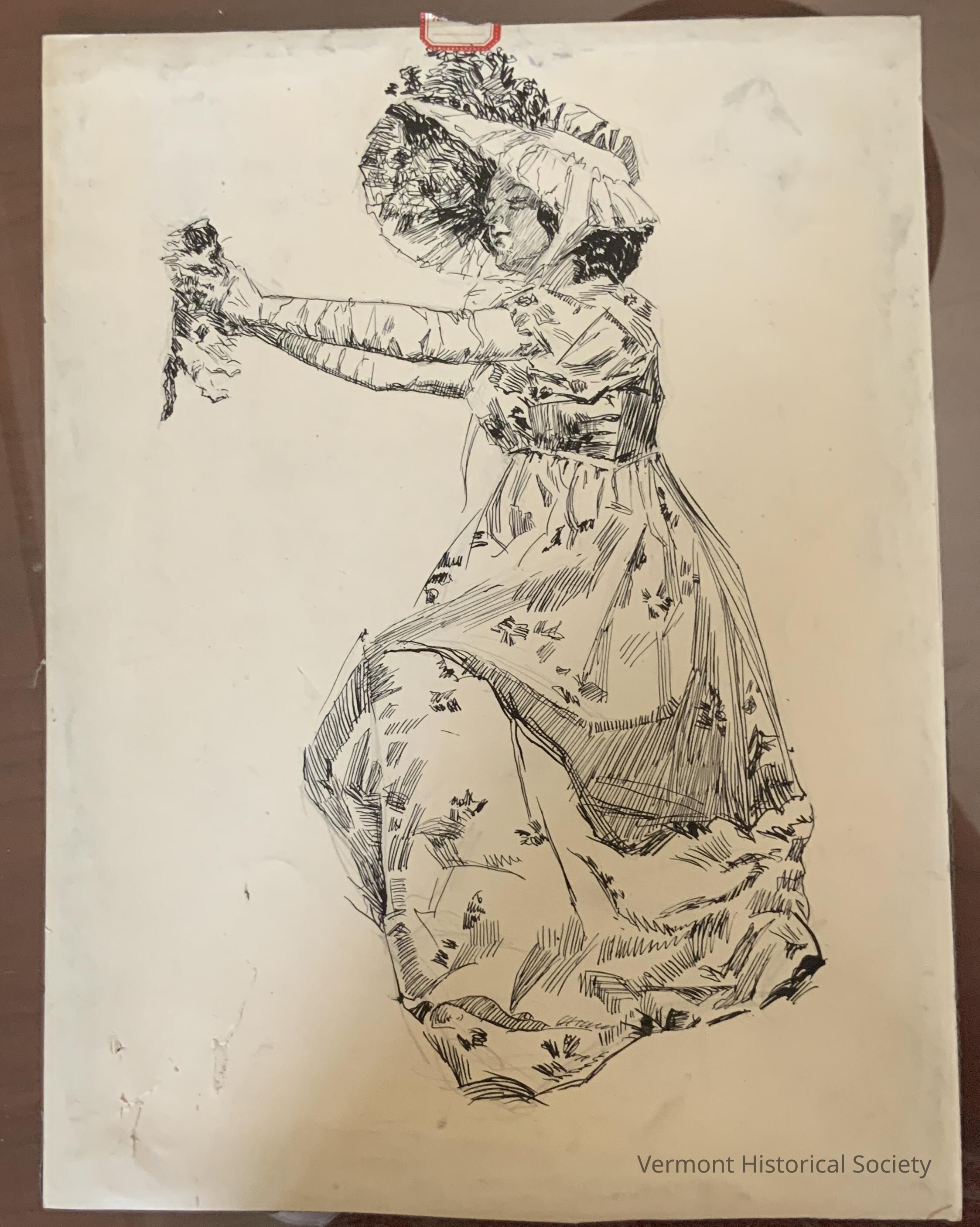 A drawing of a woman in an elaborate patterned dress and large hat tied under her chin with a ribbon and decorated with flowers. In her outstretched arms she holds a kitten, which she looks at. Unsigned and undated. There is a sticker on the top of the paper and a piece of fabric glued to the back of the paper, which has a border of black.Type of Drawing