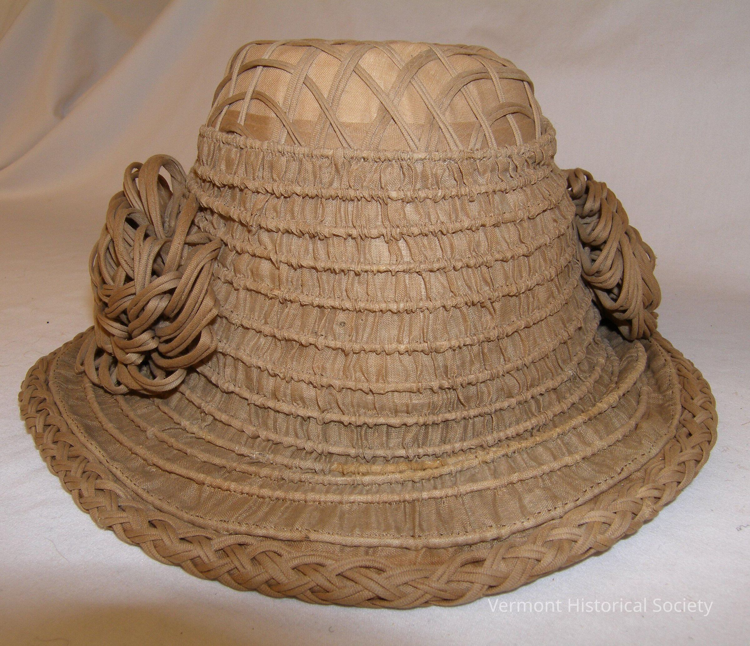 Tan silk bonnet on a wire frame. The bonnet is decorated with tubes of silk, plaited together in imitation of straw. There is a large flower on either side of the bonnet made from this imitation straw. Sheer silk fabric is shirred around these tubes on the exterior of the brim. The interior of the brim is lined with lace, and the interior of the crown is lined with white silk.