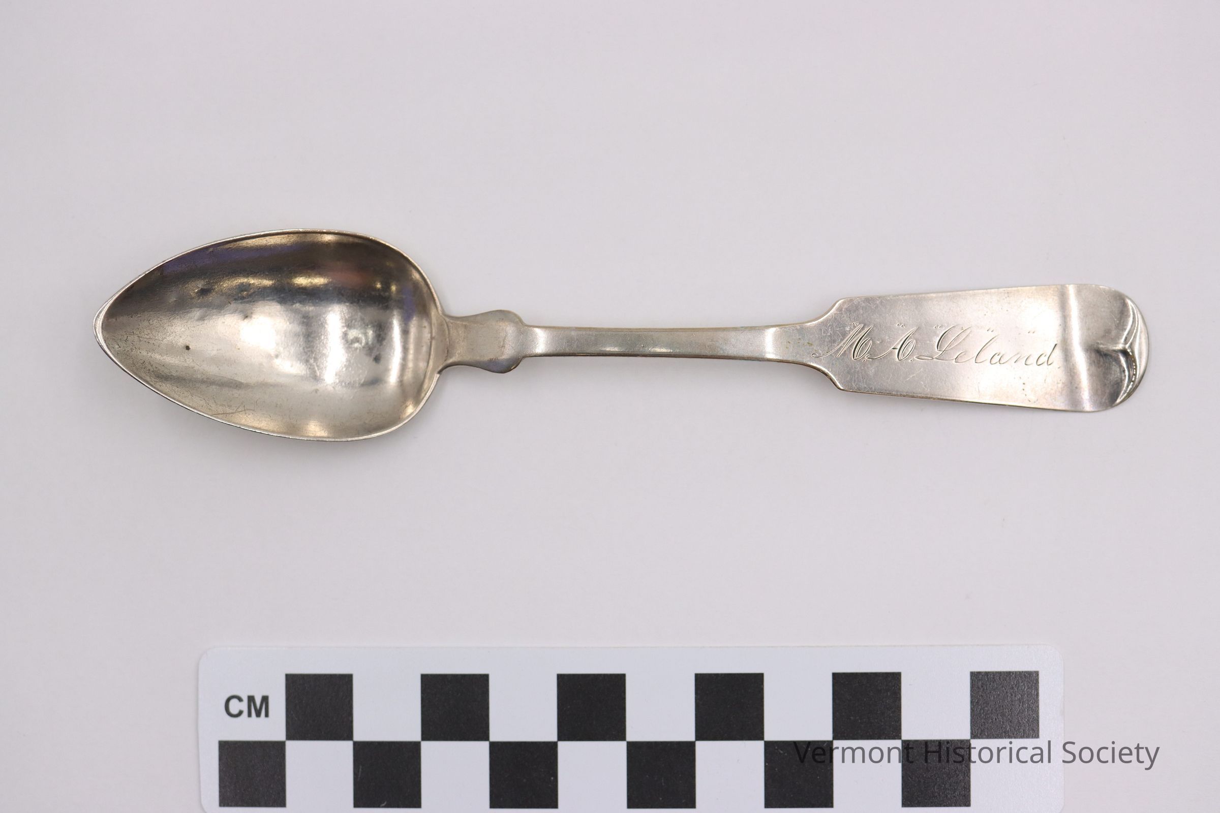 Silver teaspoon with rounded shoulder and downturned fiddle handle. The handle is engraved with the name "M. A. Leland." The back of the handle is marked, "F.CHAFFEE" along with an image of a bird and the letter P.