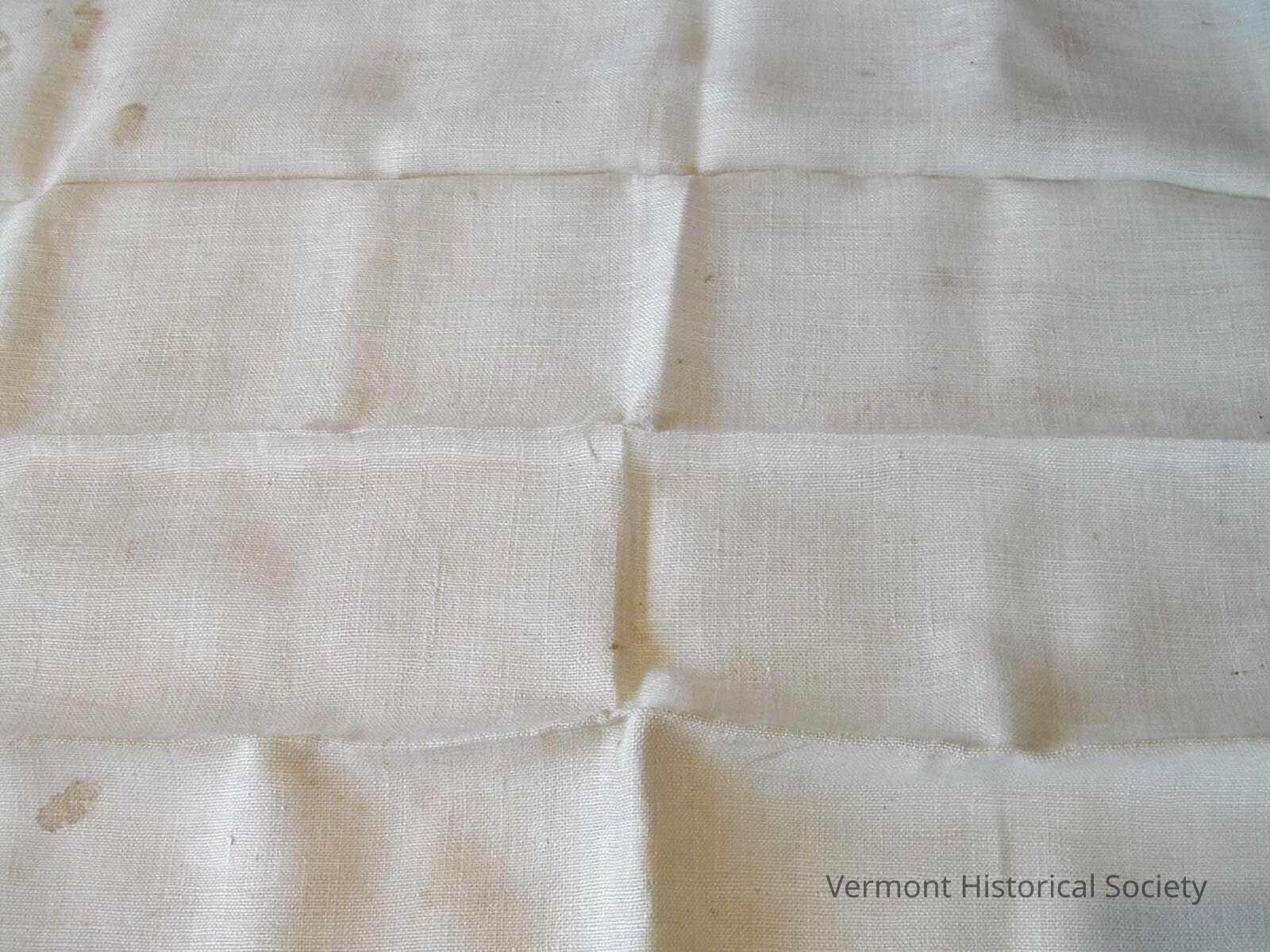 Plain-woven white linen towel. The long edges are hemmed and the short edges are selvedges.