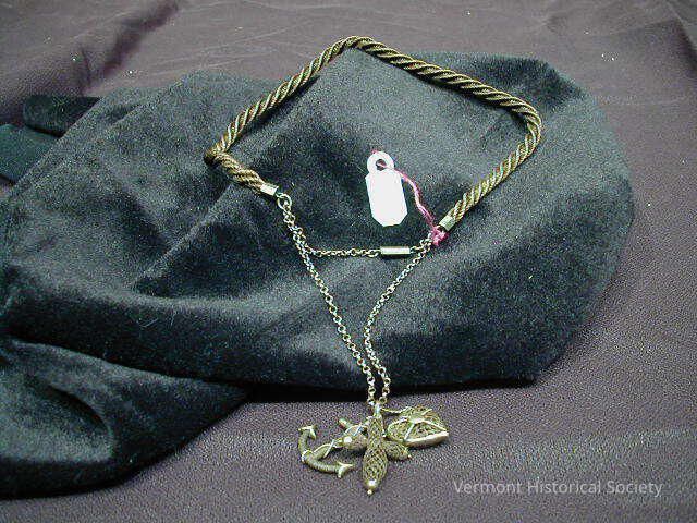 Necklace consisting of a metal chain, decoratively woven rope made of human hair, and 3 pendants made of human hair. The pendants are in the shape of an anchor, a cross, and a heart. All the hair appears to be from the same person.