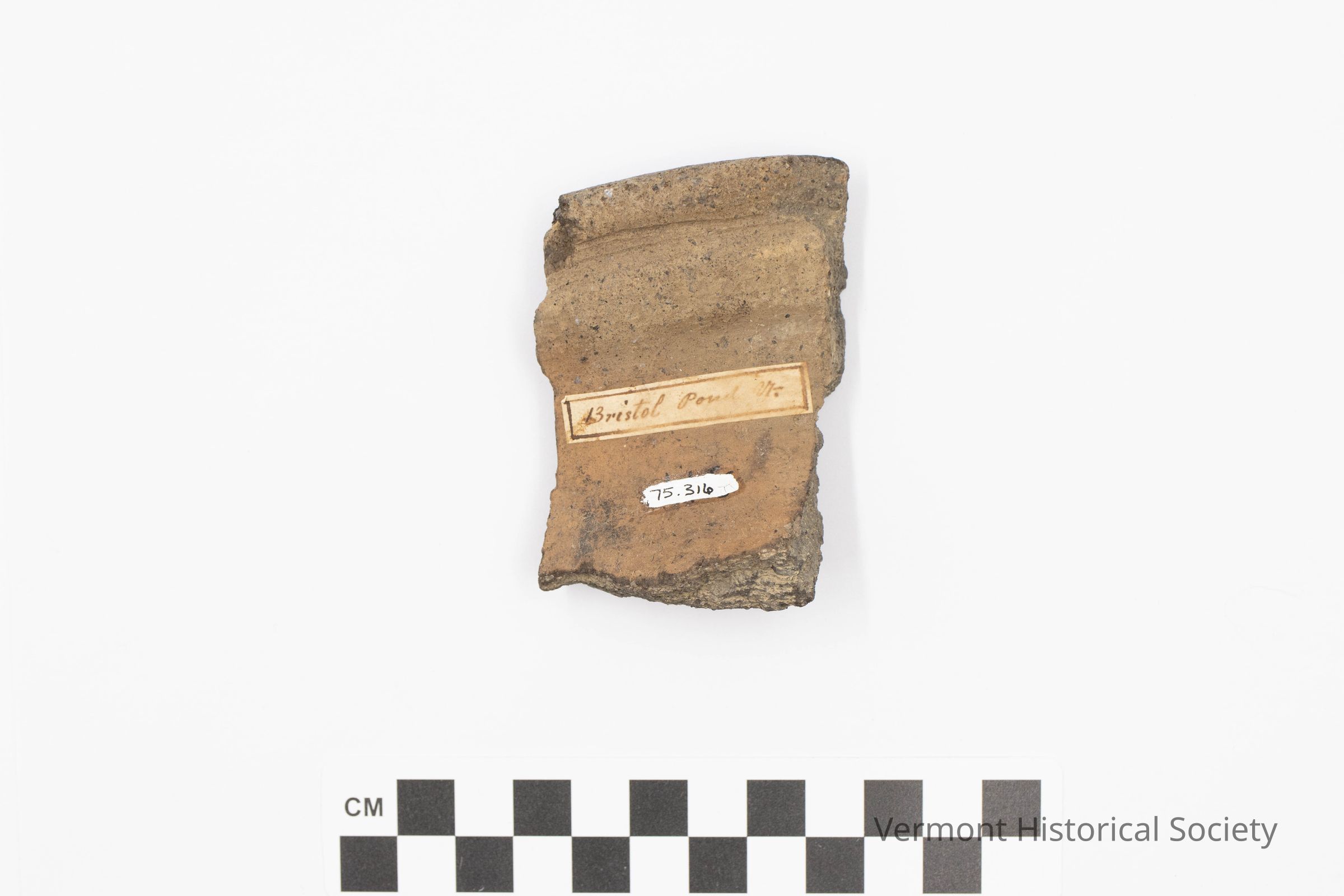 Rim sherd with a short row of vertical dentate stamping followed by 3 rows of horizontal incised lines and a vertical row of dentate stamping. It has an incurvate, undecorated shoulder and a flat, undecorated lip.