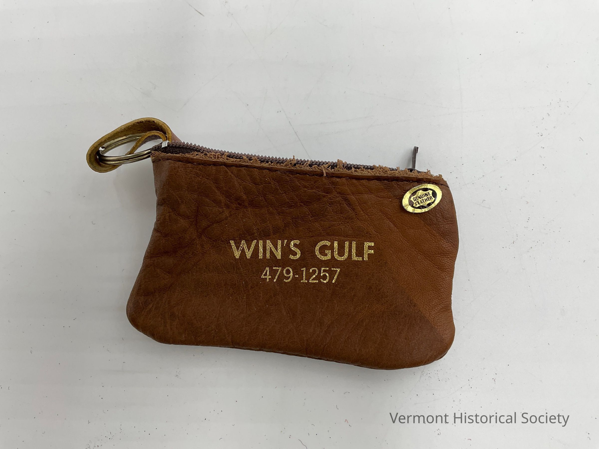 Small leather change purse that zips. The name of a business is printed in gold on the side of the purse. It says, "Win's Gulf, 479-1257."Context