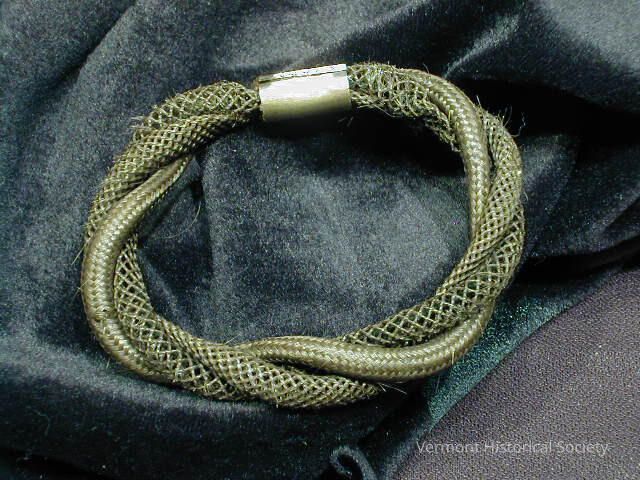 Bracelet made from 3 hollow woven tubes of human hair. The tubes are twisted together and secured with a metal clamp. The name "Fannie" is engraved on the metal.