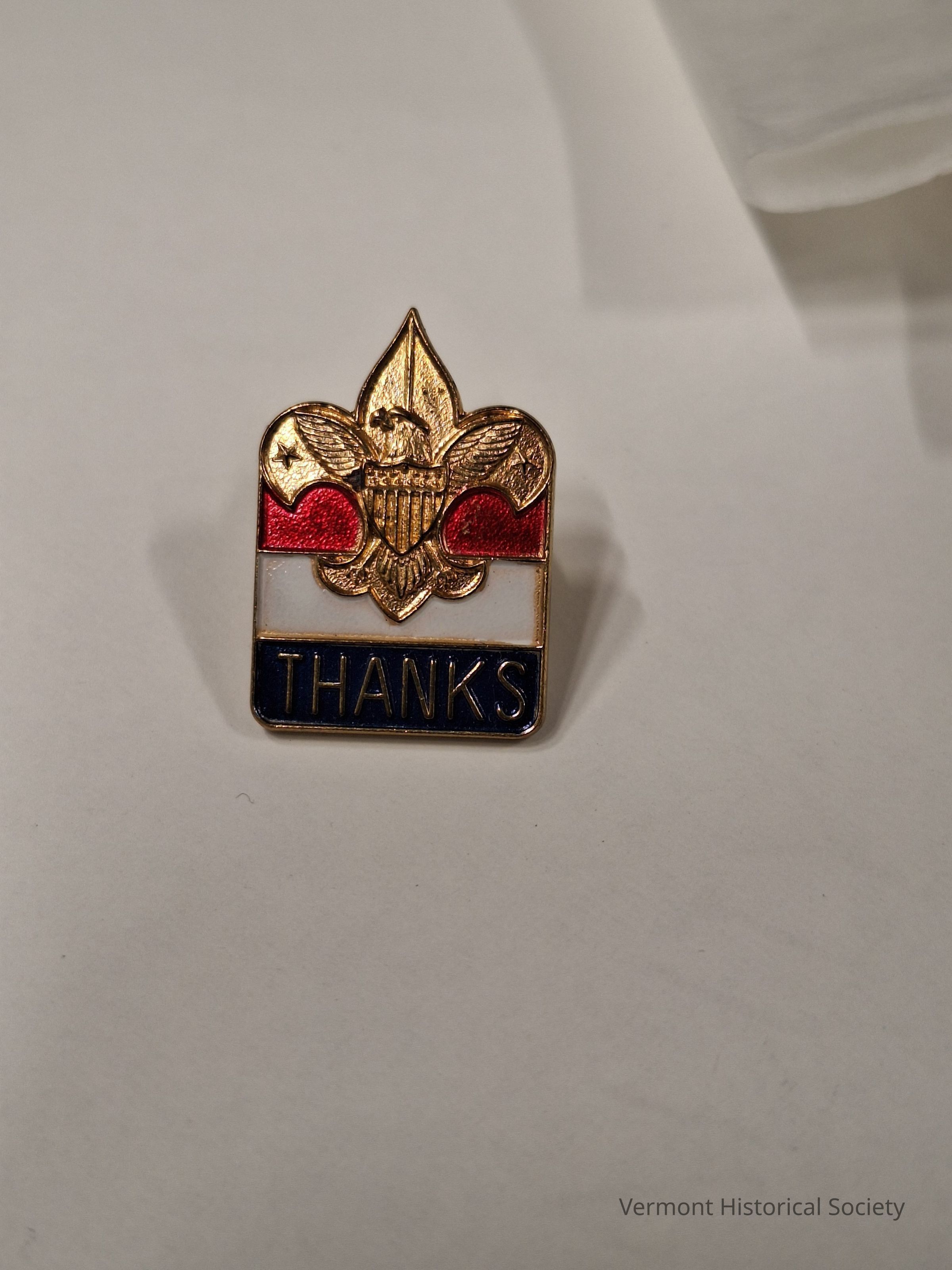 Metal pin for Kenny Lindner in thanks for work as part of Waterbury Cub Scout Pack 711. The rectangular pin has a fleur-de-lis at the top half with a red, white, and blue stripe behind and below it. "THANKS" is emblazoned in bronze on top of the blue enamel.