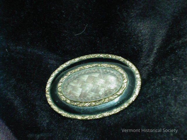 Oval mourning brooch. The brooch contains a woven medallion of blonde hair edged with a narrow plait beneath a clear glass window. It is surrounded by 2 gold bands and a black enamel band.