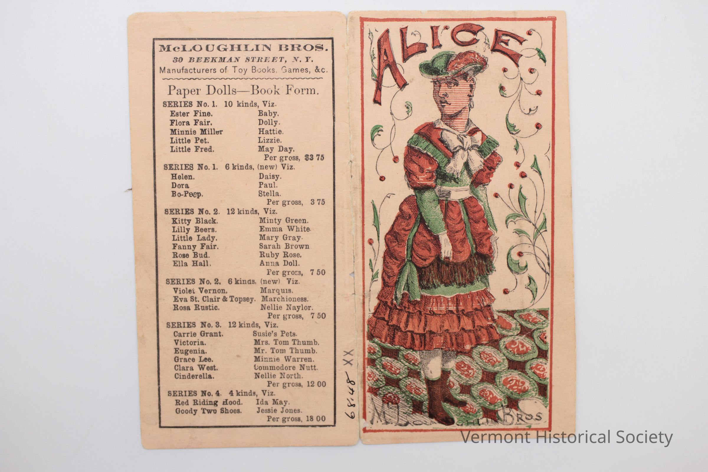 Uncut paper doll. The doll is a girl in a red and green dress, covered with fringe and ruffles. She is standing on a green and red carpet and the word "Alice" stretches across the top. To the left is a listing of other paper doll books by the same manufacturer. The reverse has instructions for how to cut out the doll and the doll's clothing.