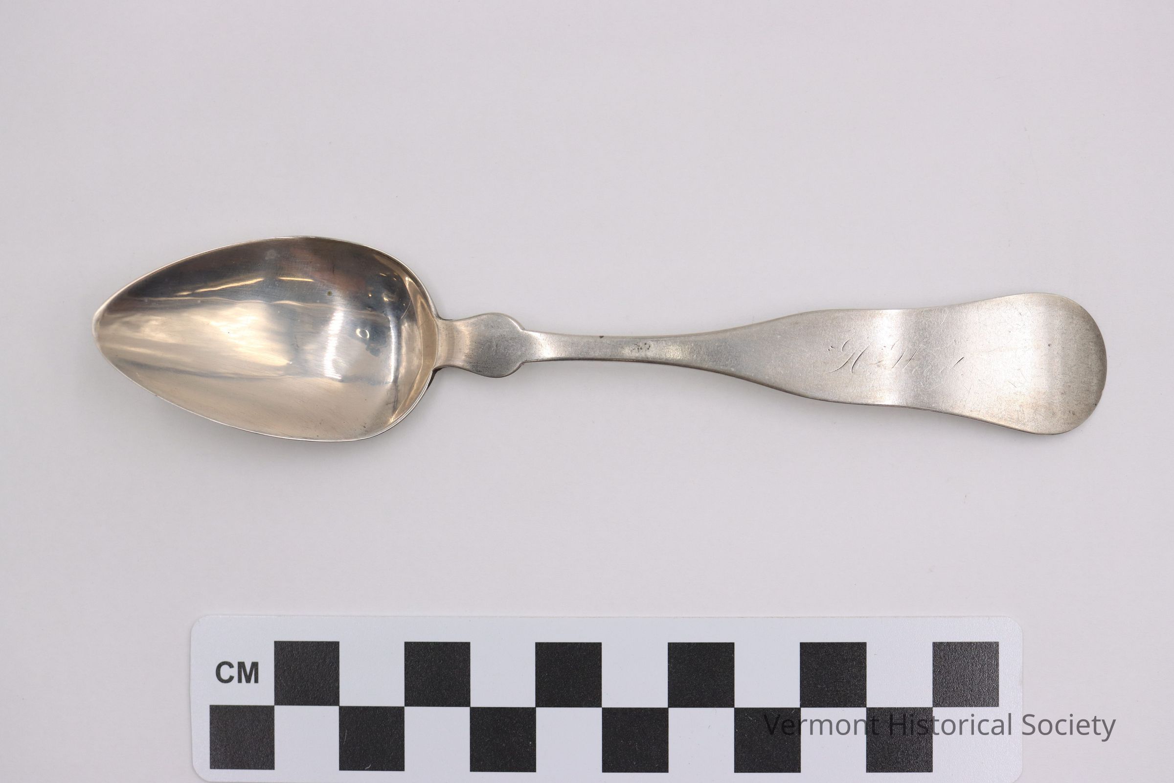 Silver teaspoon with round shoulder and downturned fiddle handle. The handle is engraved with the name, "H. Wood." The back of the handle is marked, "CLARK & BROS."