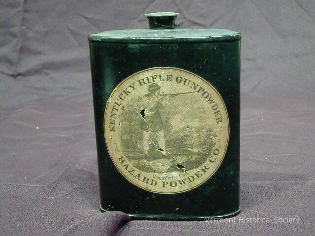 Tin powder flask with a round paper label on one side. The flask is flat on the front and back with curved sides and a small, round spout at the center top. One side has a round paper label with an engraved illustration of a man in a short tunic shooting a long gun. The words, "KENTUCKY RIFLE GUNPODER / HAZARD POWDER CO." ring the edge.