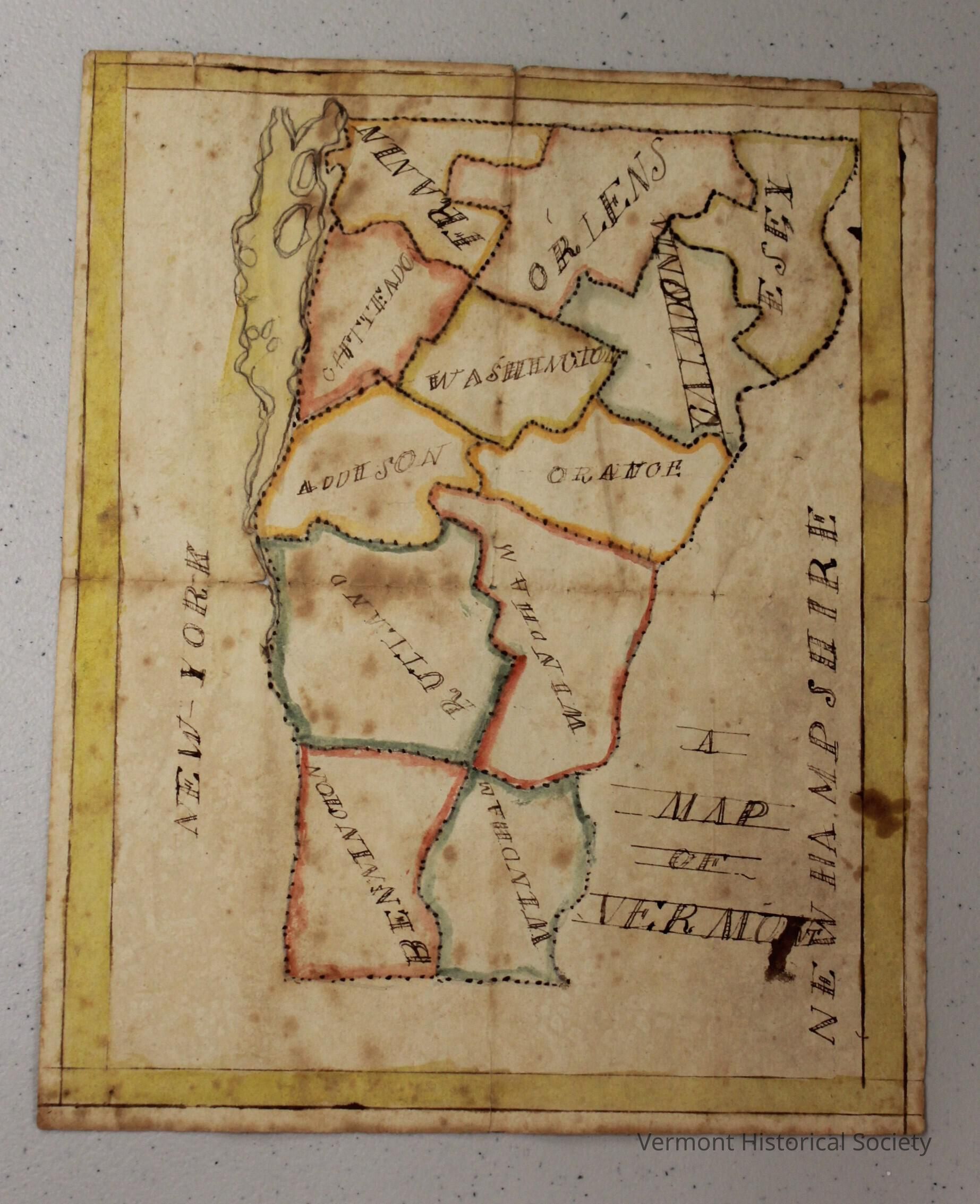 School boy map of Vermont. Map depicts 12 of the 14 Vermont counties with Lamoille county and Grand Isle county both absent, although some oft the islands that constitute Grand Isle county appear to be depicted. The Borders of each county are composed of dotted lines of ink dot with some appearing to have a straight continues line drawn through them. The interiors of the counties close the border have been colored with water color paint but only a small amount and most the county interiors remain colorless. The counties are all labeled with ink but the handwriting and spelling of the labels makes it difficult to tell weather the labels are accurate. The only major physical feature of the state depicted is Lake Champlain, whose border is drawn with curved lines and whose island are shown through the use of round oval like shapes. The New York and New Hampshire borders are both simply labeled with in ink, with no mention of the Canadian or Massachusetts borders. Both states are just Labeled New York and New Hampshire receptively. The map title is located in the lower left corner with it simply reading "A map of Vermont" although T is obscured due to damage that either took place during or after production. Lines used to draw the title are still visible. The edge of the map is composed of two lines encompassing yellow water color, though foxing has caused much of it to turn brown. On the back of the map the artist's name is displayed as reading Martin M Flint, drawn by Myself. An inscription on the back says to "H.M Ditz".