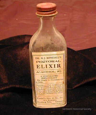 Glass medicine bottle with metal screw top. The bottle is made of clear glass with a metal screw top colored red. An aged paper label with black printed lettering is adhered to the bottle. The label has two parallel thin black lines on the edges of the label creating a frame around the text. The label reads, “DR. B.J. KENDALL’S / PECTORAL / ELIXIR / ALCOHOL 5% / A STIMULATING / EXPECTORANT / For Coughs or Hoarseness due to Colds.” and continues on with “Directions:- For Adults 1-2 to 2 teaspoonfuls 4 or 5 times a day. For a Child 6 years old 15 to 40 drops, 2 years old, 10 to 20 drops, 1 year old, 5 to 15 drops, If the above doses cause sicknese at the stomach take smaller doses. / Kimball’s Bros. & Co., Inc. / Sole Proprietors, Enosburg Falls, - Vermont.” The lettering is subdivided by thin black lines.Context