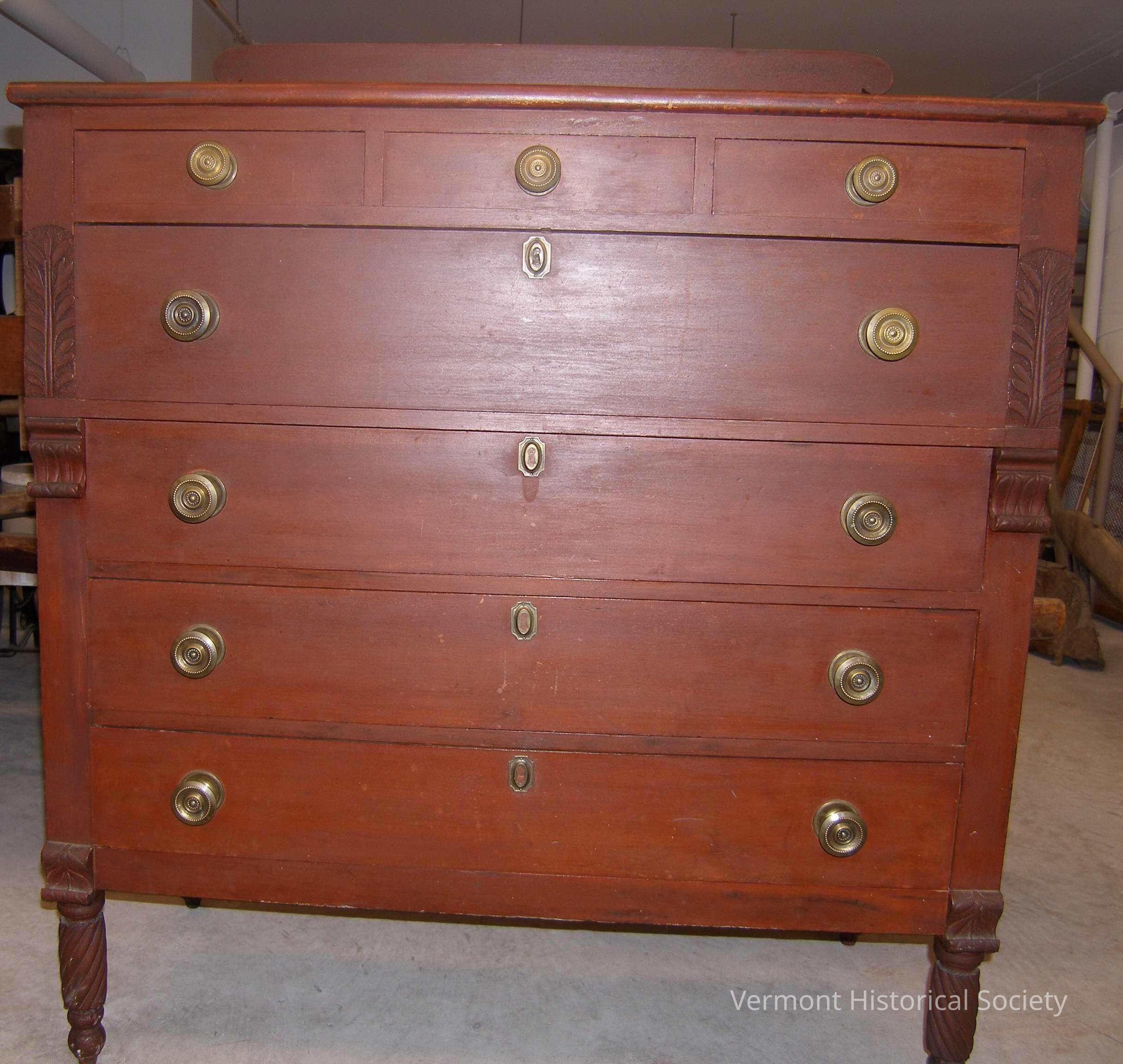 7-drawer chest of drawers made of cherry and white pine. The chest has a flat front with 5 rows of drawers. There are 3 drawers in the top row; each lower drawer spans the entire width of the chest. The drawers have large, round brass pulls. The sides of the front are carved with acanthus leaves, and the legs are decoratively turned. The backboard has scrolled ends. It is signed, "Aaron Miltimore / Weston Vermont".Context