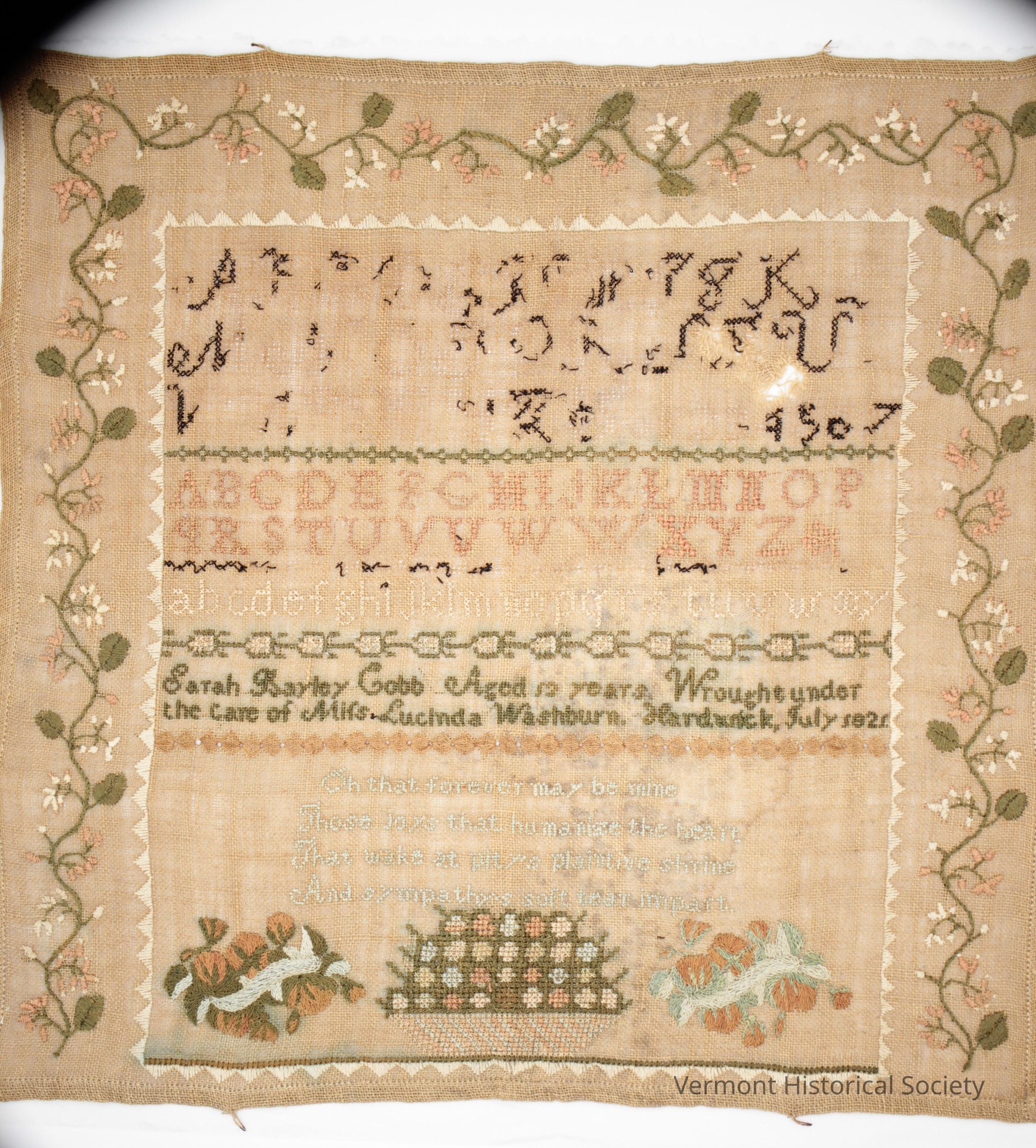 Across the center in green thread is the inscription, "Sarah Bayley Cobb Aged 12 years. Wrought under/the care of Mifs Lucinda Washburn. Hardwick, July 1821," followed by a border of queen stitches in pink thread. Beneath the border is the verse, "Oh that forever may be mine/ Those joys that humanise the heart/That wake at pity's plaintive shrine/And sympathy's soft tear impart."