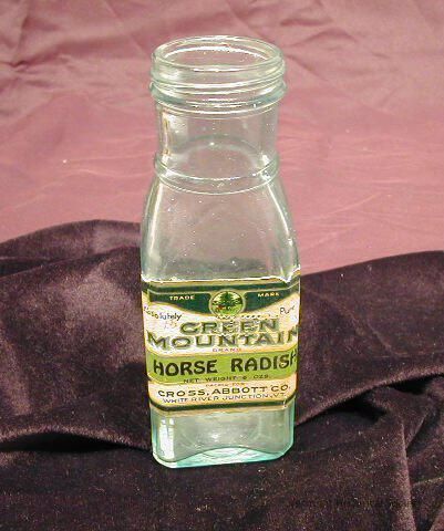White River Jct., Vt. A blue/green glass jar that contained horse radish. The rectangular base comes up straight to beyond the label where it narrows to a round nect of 1.625" diam. The label reads "TRADEMARK/ Absolutley Pure/ GREEN/MOUNTAIN/BRAND/HORSERADISH/ NET WEIGHT 6OZS..." the bottle is fairly clean. The label has a few losses.