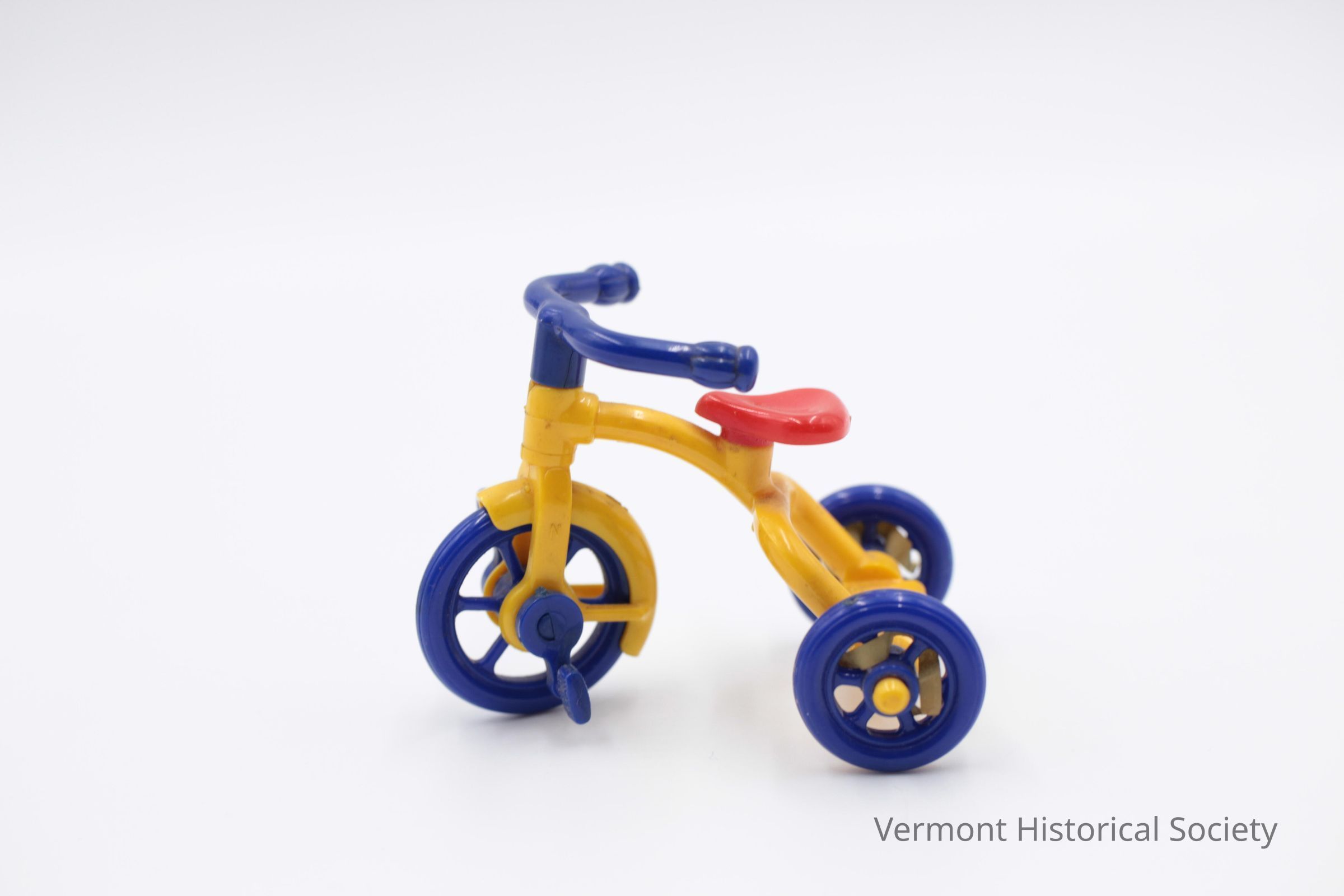 Miniature plastic tricycle sized for a dollhouse. The frame is made of yellow plastic, and it has blue plastic wheels, pedals and handles, and a red plastic seat.Context