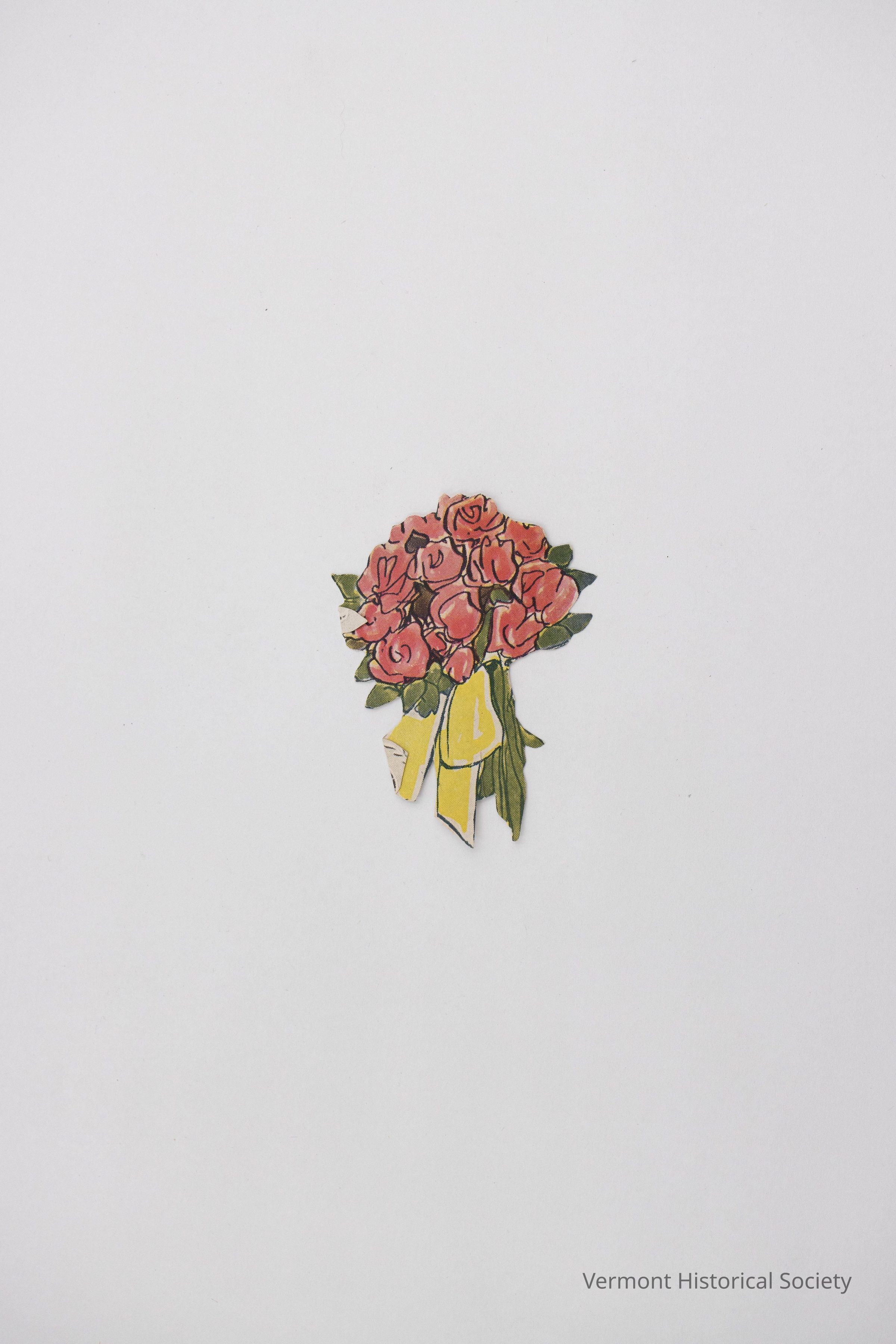 Printed paper floral bouquet for a paper doll. It consists of pink roses with a yellow ribbon.Context