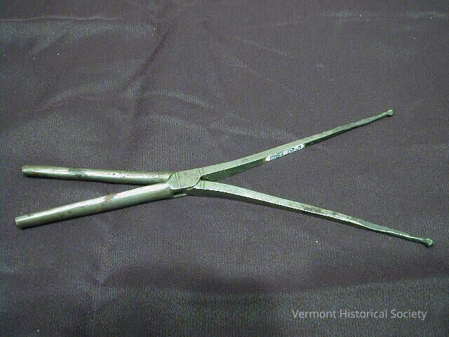 Wrought iron curling iron. It hinges open at the center, similar to a pair of scissors. The curling side consists of a metal tube on one side and U-shaped piece on the other side. The tips of the handles are balls.