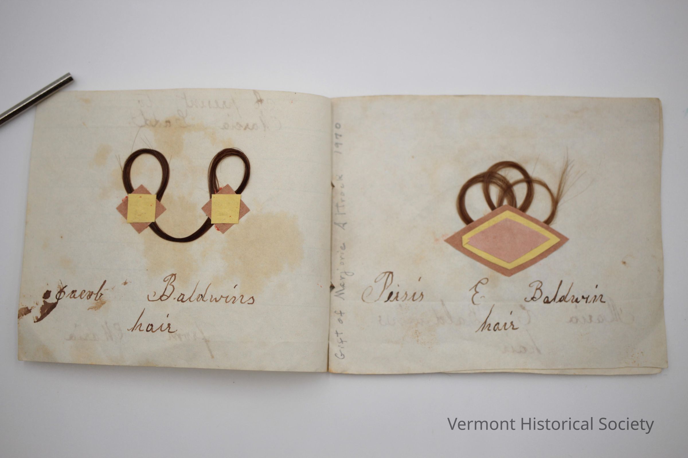 This 8 page booklet contains locks of hair, each of which is neatly arranged in small loops and fastened to the page with small designs of colored paper. There are locks from Maria C. baldwin, Jacob Baldwin, Persis E. Baldwin, Mary E. Baldwin, Elvira C. Baldwin and Lucy Baldwin. Cover reads "a present to Marcia Ladd/ from Maria." There are two loose samples of hair added after the book was made.Acquisition