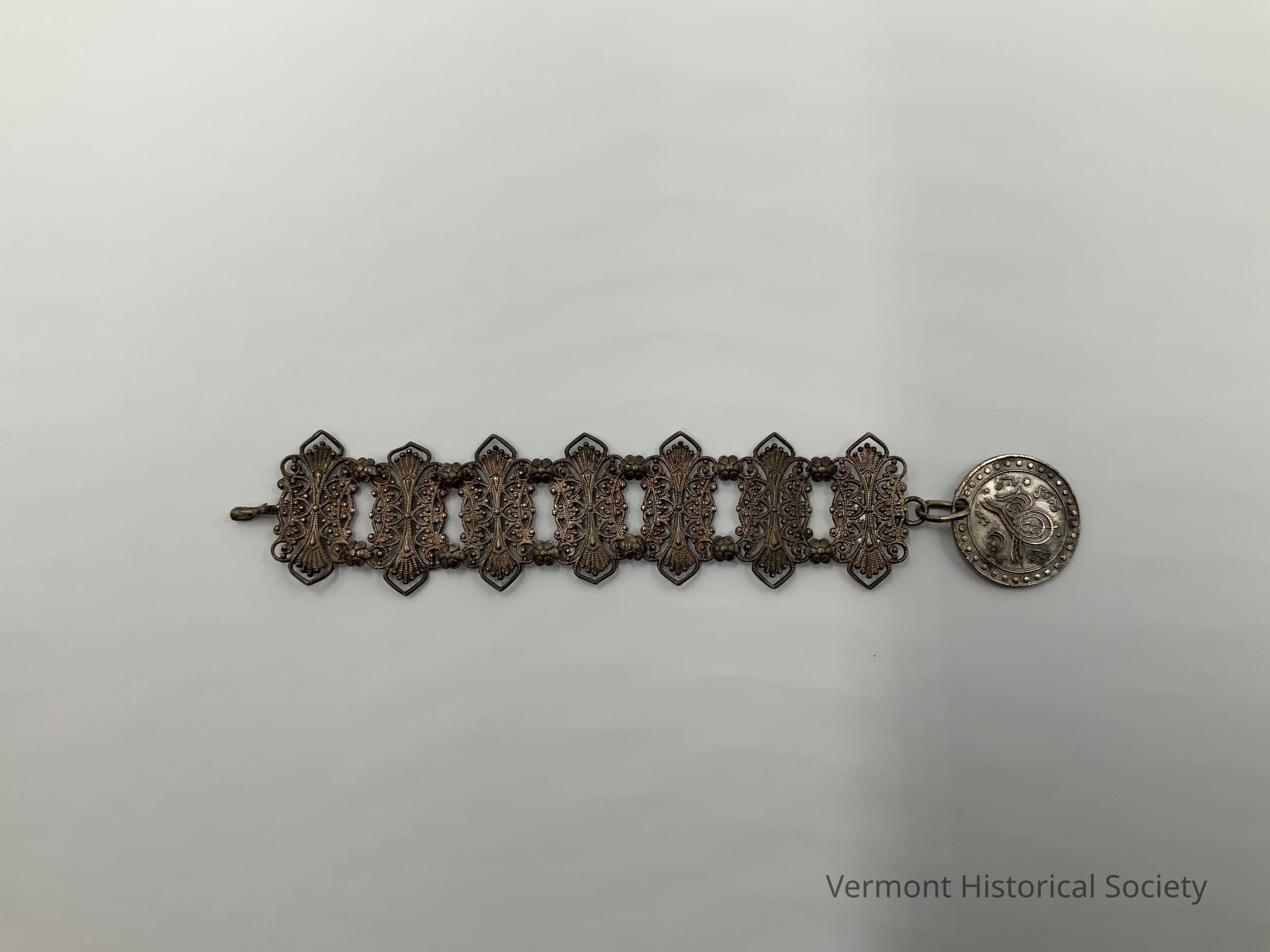 Silver filigree bracelet consisting of seven cartouches with a round medallion on one end.