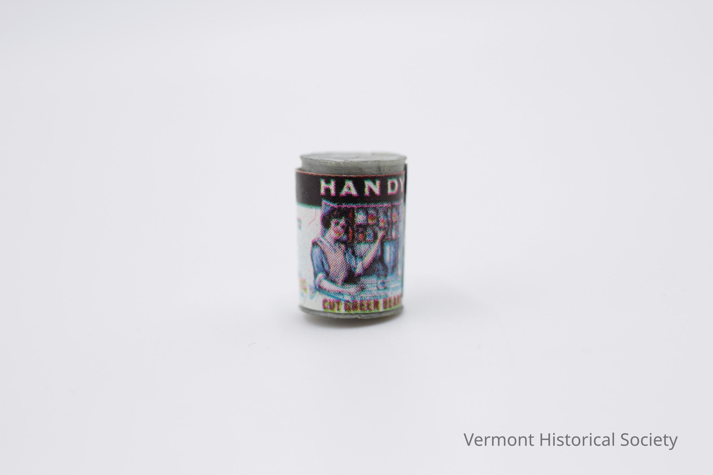 Miniature cylindrical food-storage can. The can is made of silver-colored plastic and is wrapped with a printed paper label. One side of the paper label shows several green beans with the words, "HANDY WISCONSIN CUT GREEN BEANS". The other side shows a woman in a shop uniform gesturing to some shelves with the words, "HANDY CUT GREEN BEANS".Context