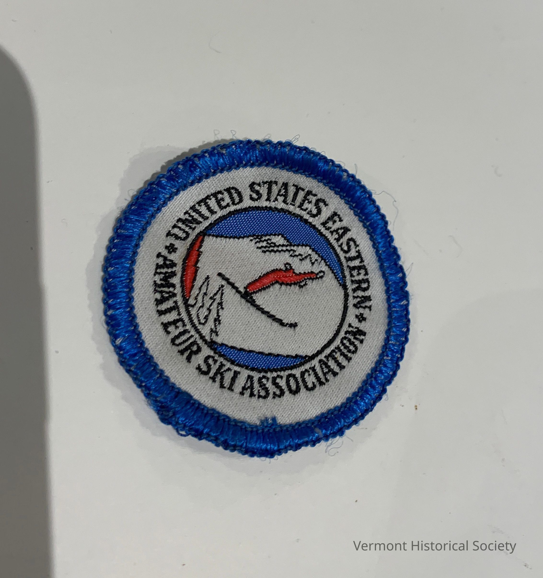 Circular patch with light blue top-stitched edging. THe patch has a white ground with a central round inscription that reads "UNITED STATES EASTERN AMATEUR SKI ASSOCIATION" in black embroidered lettering. In the center of the patch is a ski jumper in a red suit against a background of white snow peaks and blue sky.
