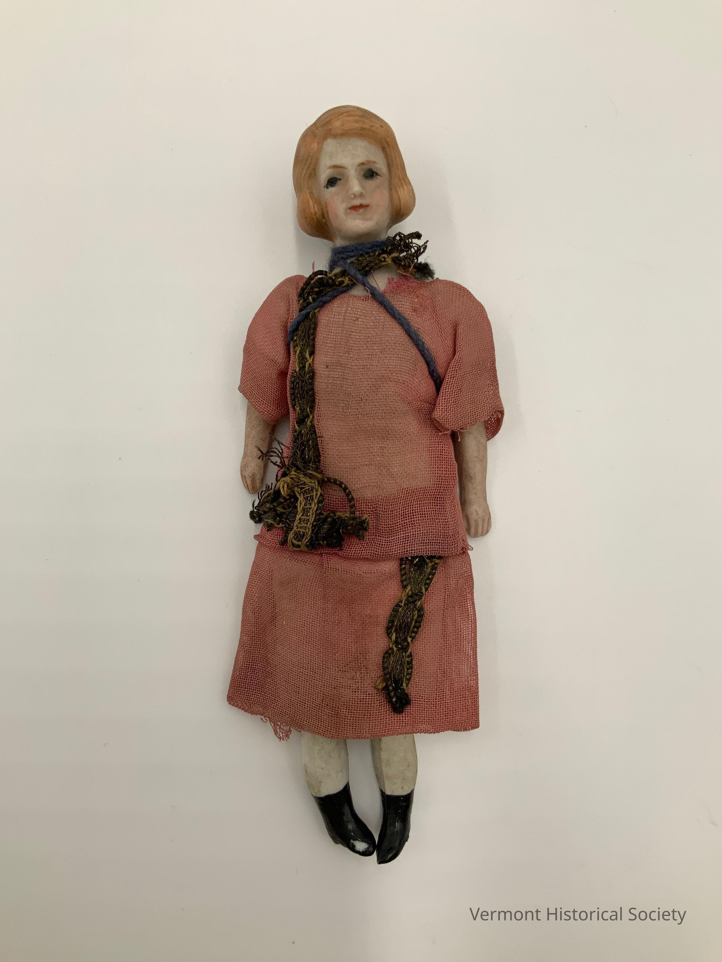 Small doll with porcelain head, arm, and legs, and a soft body. The doll has molded hair painted blonde and styled into a faux bob with a bun in the back. The face is molded and painted with blue eyes, pink cheeks, and pink lips. It is wearing a dress made of pink gauze with a dropped waist accented with braided trim. There is a blue yarn wrapped around the neck and crossed around the torso. The skin on the bust and arms is painted cream color. The legs are left white with painted-on black boots.Context