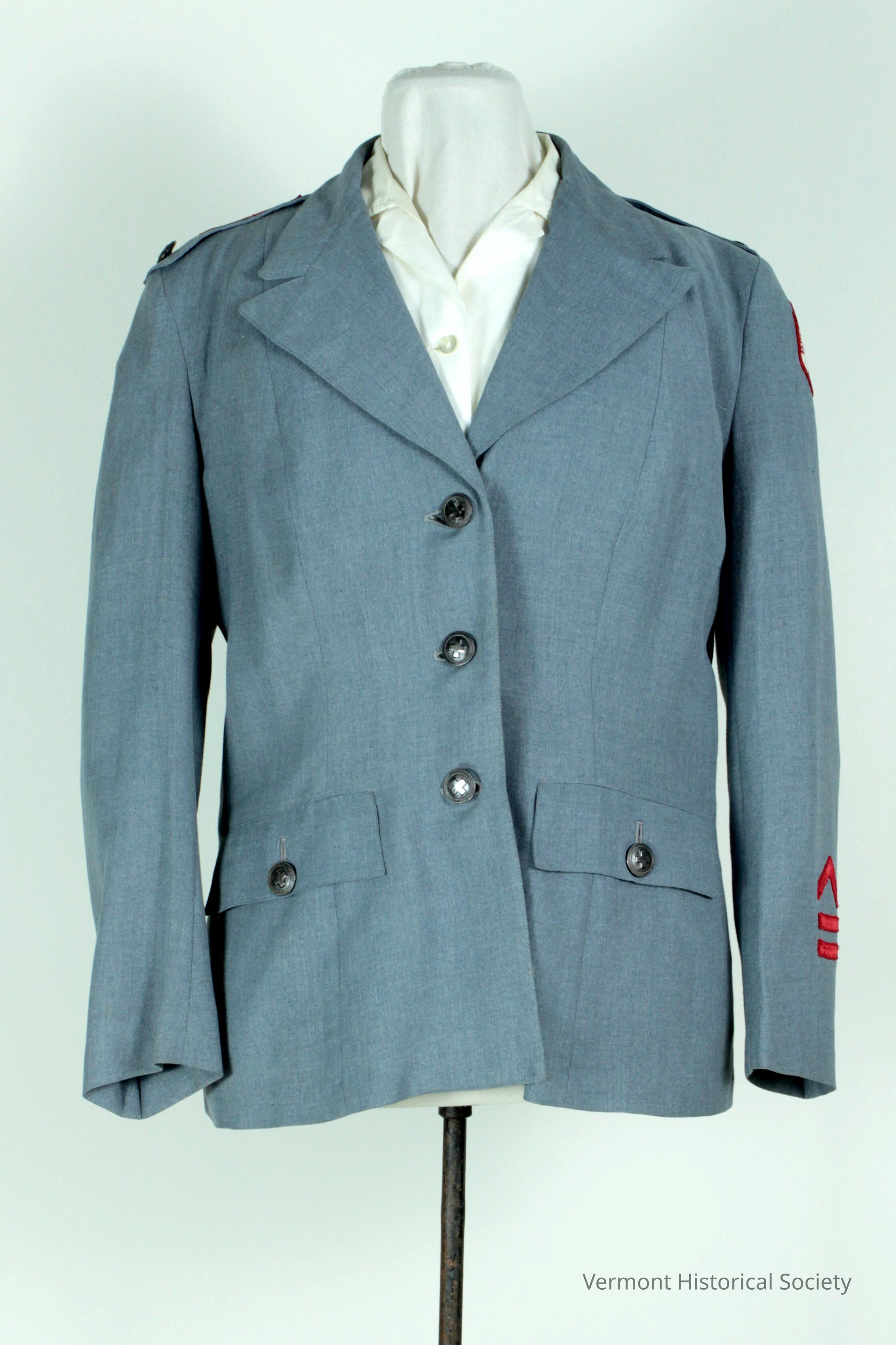 Grey blazer with red ribbon epaulets and red insignia on the left sleeve. The blazer secures in the front with three metal buttons, each molded with a cross. The epaulets secure with the same metal buttons on the outside, and smaller, brown plastic buttons toward the collar. There are two pockets on the front that secure with flaps held with metal cross buttons. The upper left sleeve has a round white patch with a red cross in the center and the words, "AMERICAN RED CROSS SERVICE" around the edge. The right sleeve has three small embroidered patches near the cuff: a chevron above two bars.Context