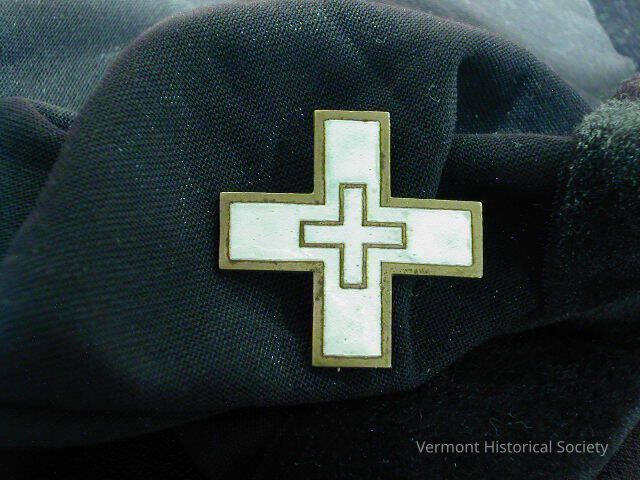 Enameled metal pin in the shape of a cross with 4 even sides. There is a smaller cross inlaid at the center. The reverse has a hinged pin.