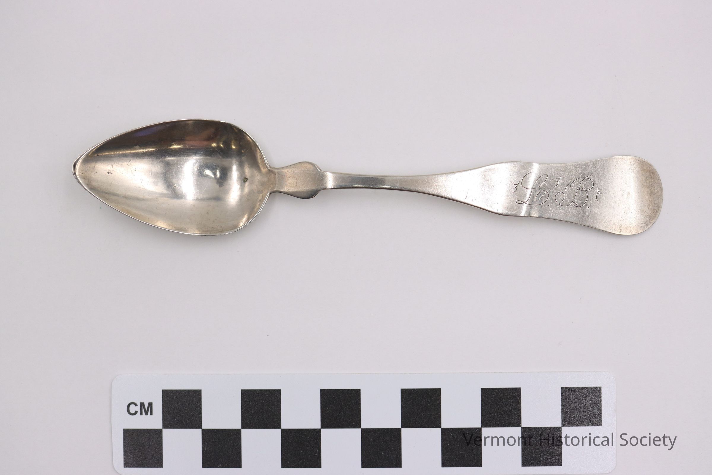 Silver teaspoon with pointed shoulder and downturned fiddle handle. The handle is engraved with the initials "L.B." The back of the handle is marked, "H.M.NICHOLS".