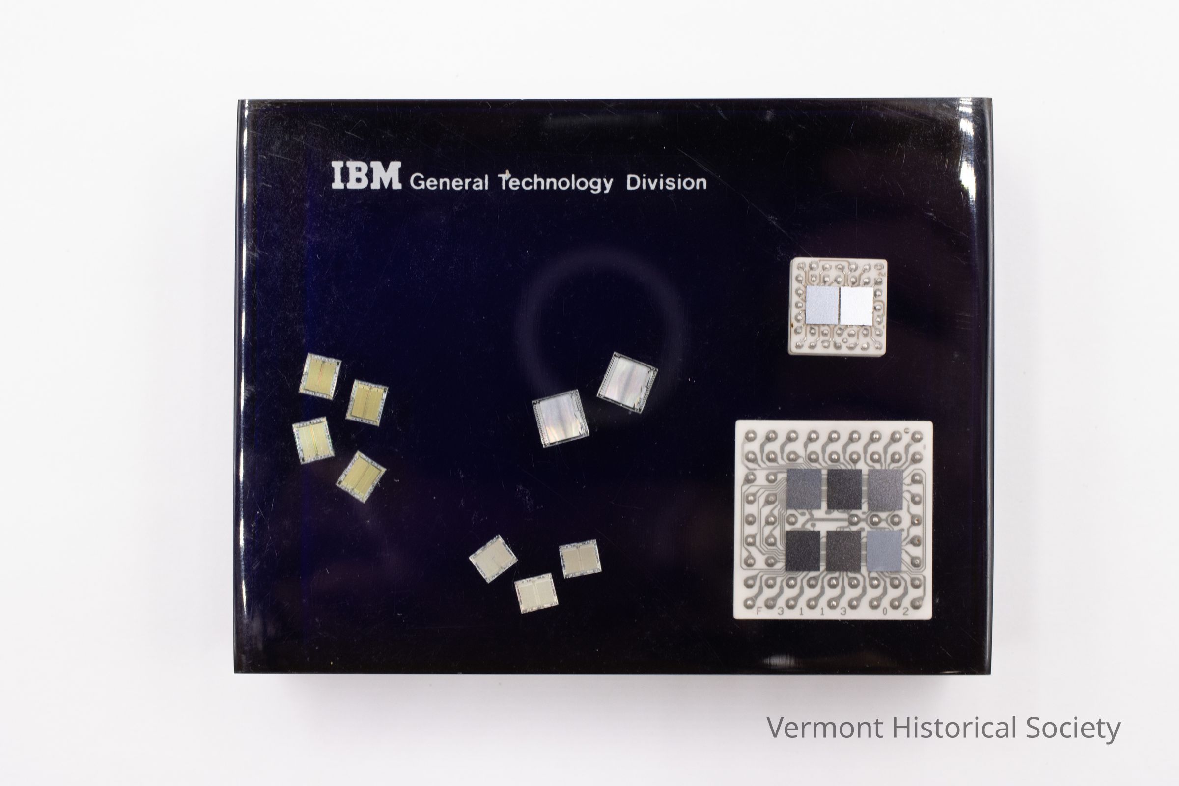 Rectangular resin paperweight containing silver-toned computer chips on a black ground. The base is printed in white with the words, "IBM General Technology Division," viewable through the clear resin.