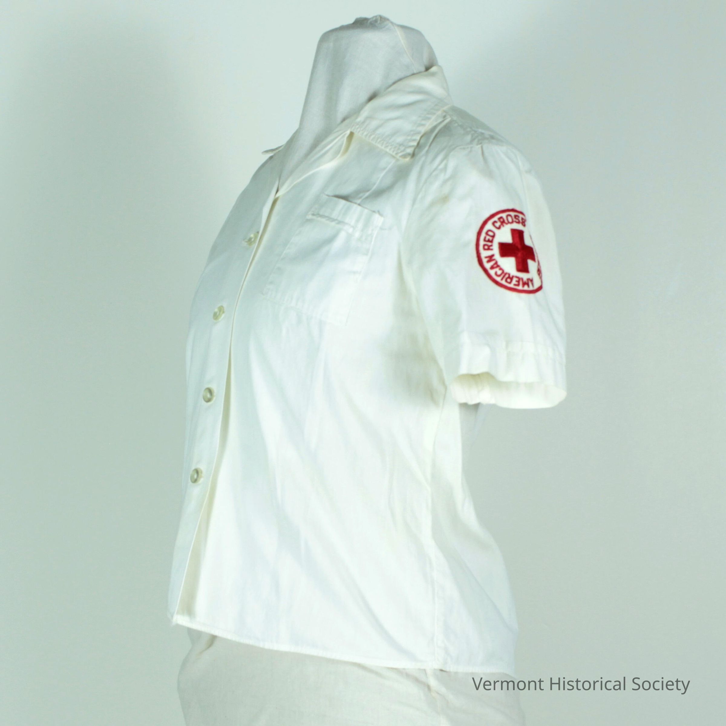 White cotton short-sleeved shirt. The shirt has a point fall collar and secures up the center front with five plastic buttons. There is a pocket on the proper right breast. There is a circular patch on the proper right sleeve with a red cross in the center and the words, "AMERICAN RED CROSS SERVICE", around the edge.